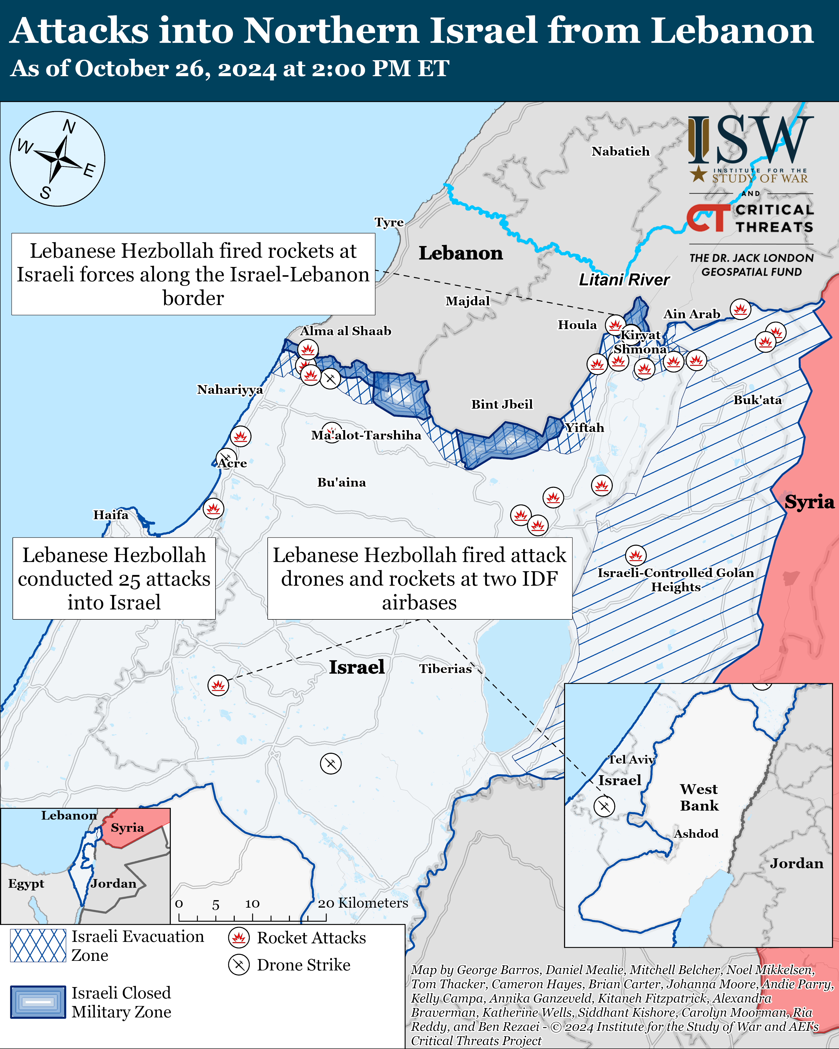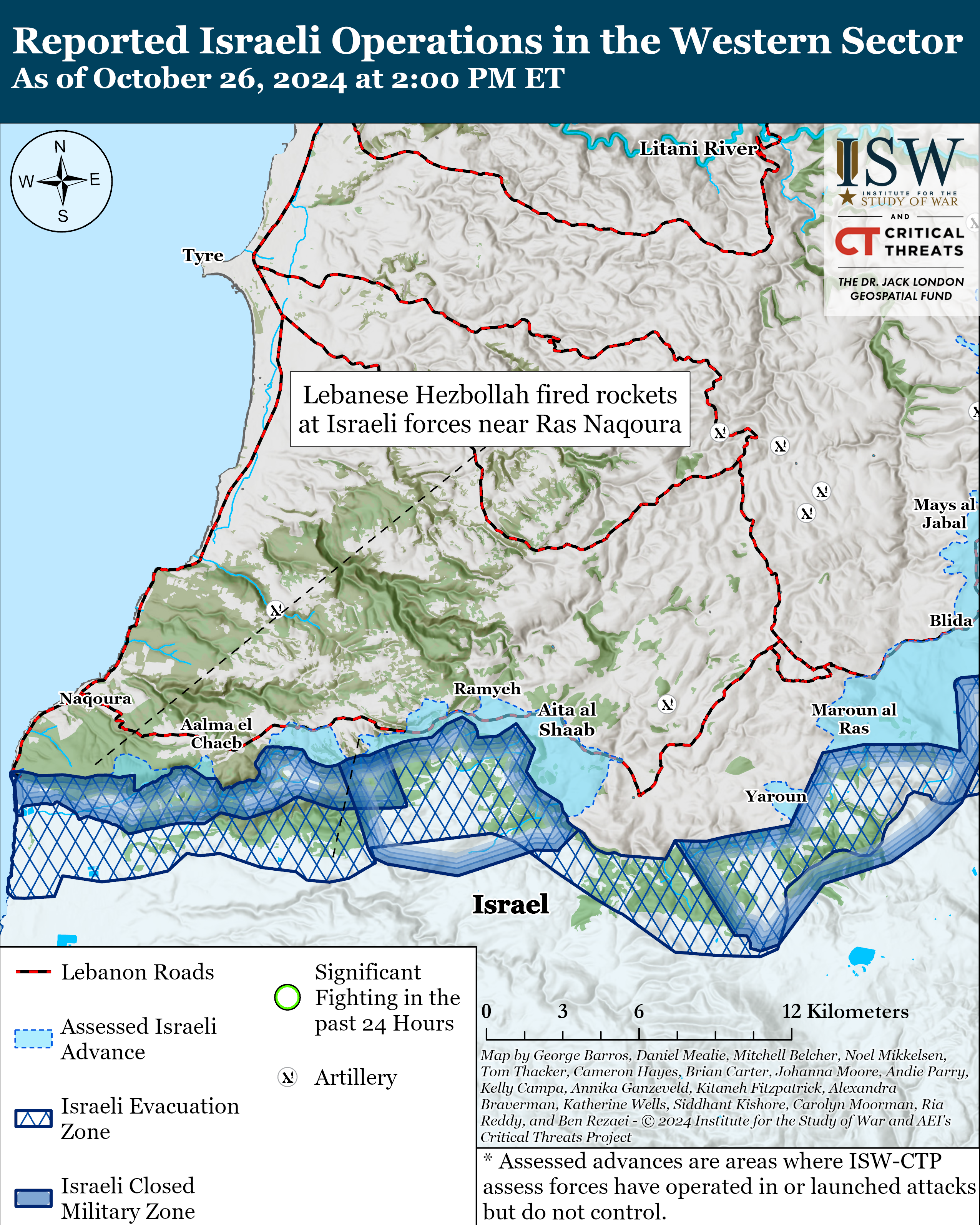 The IDF continued its air campaign to targeting Hezbollah capabilities, infrastructure, and leaders on October 26. The IDF Air Force struck over 70 Hezbollah targets across Lebanon, including anti-tank positions, ammunition depots, and military headquarters.[56] The IDF Air Force struck multiple weapons manufacturing sites and the headquarters of Hezbollah’s intelligence division in southern Beirut.[57] The IDF issued warnings to residents of Burj al Barajneh and Haret Hreik to evacuate at least 500 meters from Hezbollah infrastructure prior to attacking the area.[58] The IDF also struck a Hezbollah air defense cell that had launched a missile targeting an Israeli drone near Kfar Fila, north of the Litani River.[59]