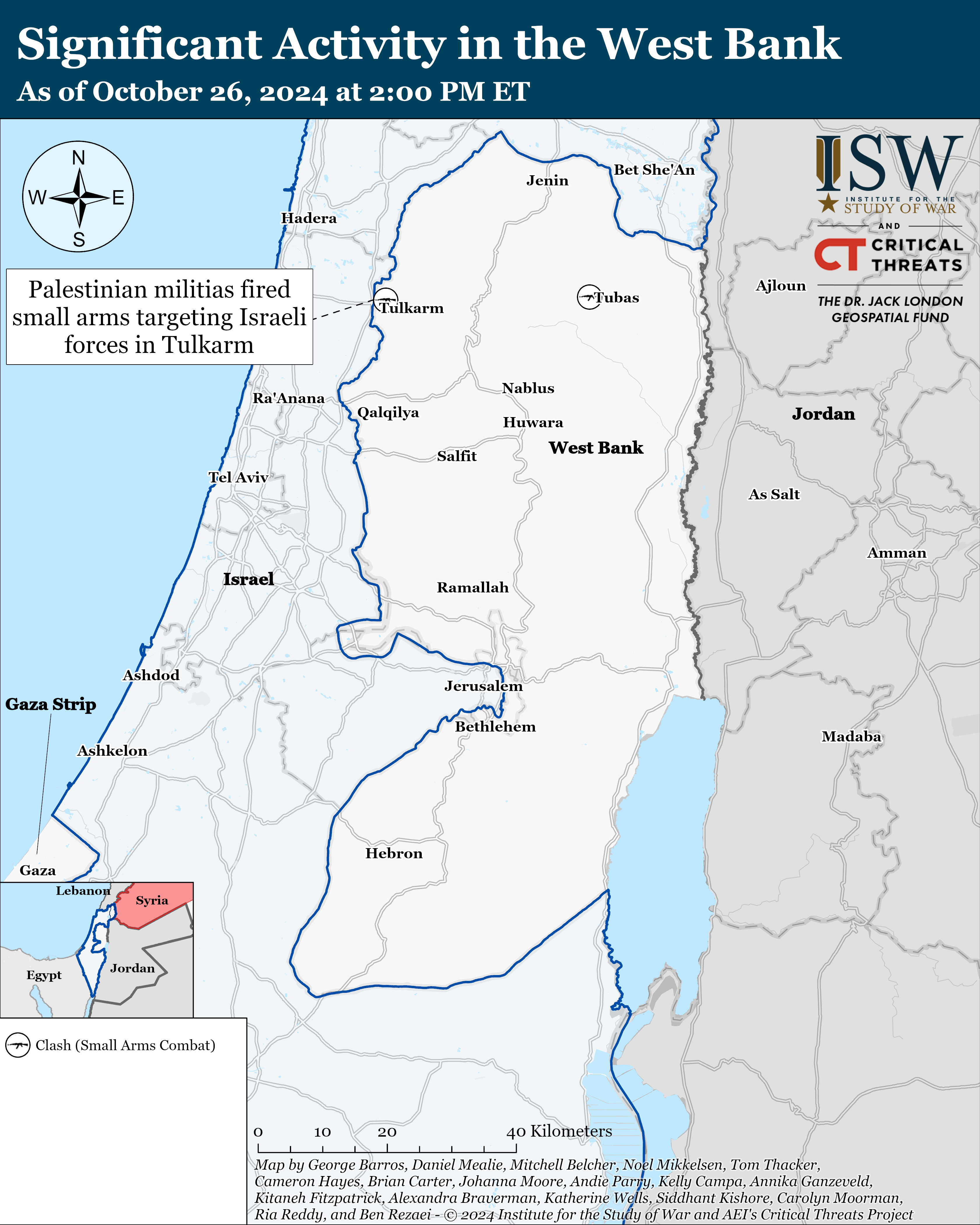 Palestinian fighters have attacked Israeli forces in at least three locations in Tulkarm since CTP-ISW’s data cutoff on October 25.[36] Palestinian Islamic Jihad (PIJ) and the al Aqsa Martyrs’ Brigades fired small arms targeting Israeli soldiers in Tulkarm.[37]