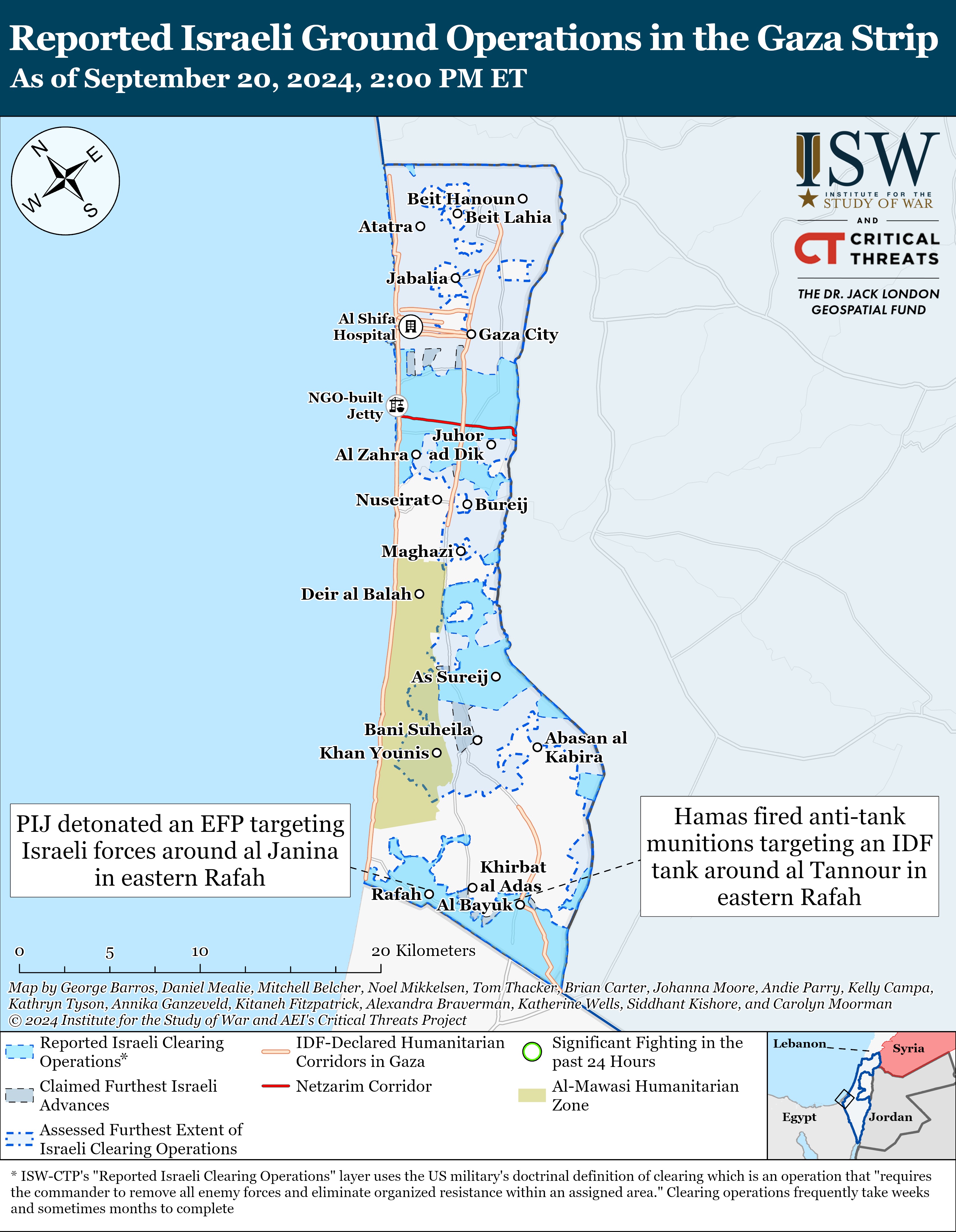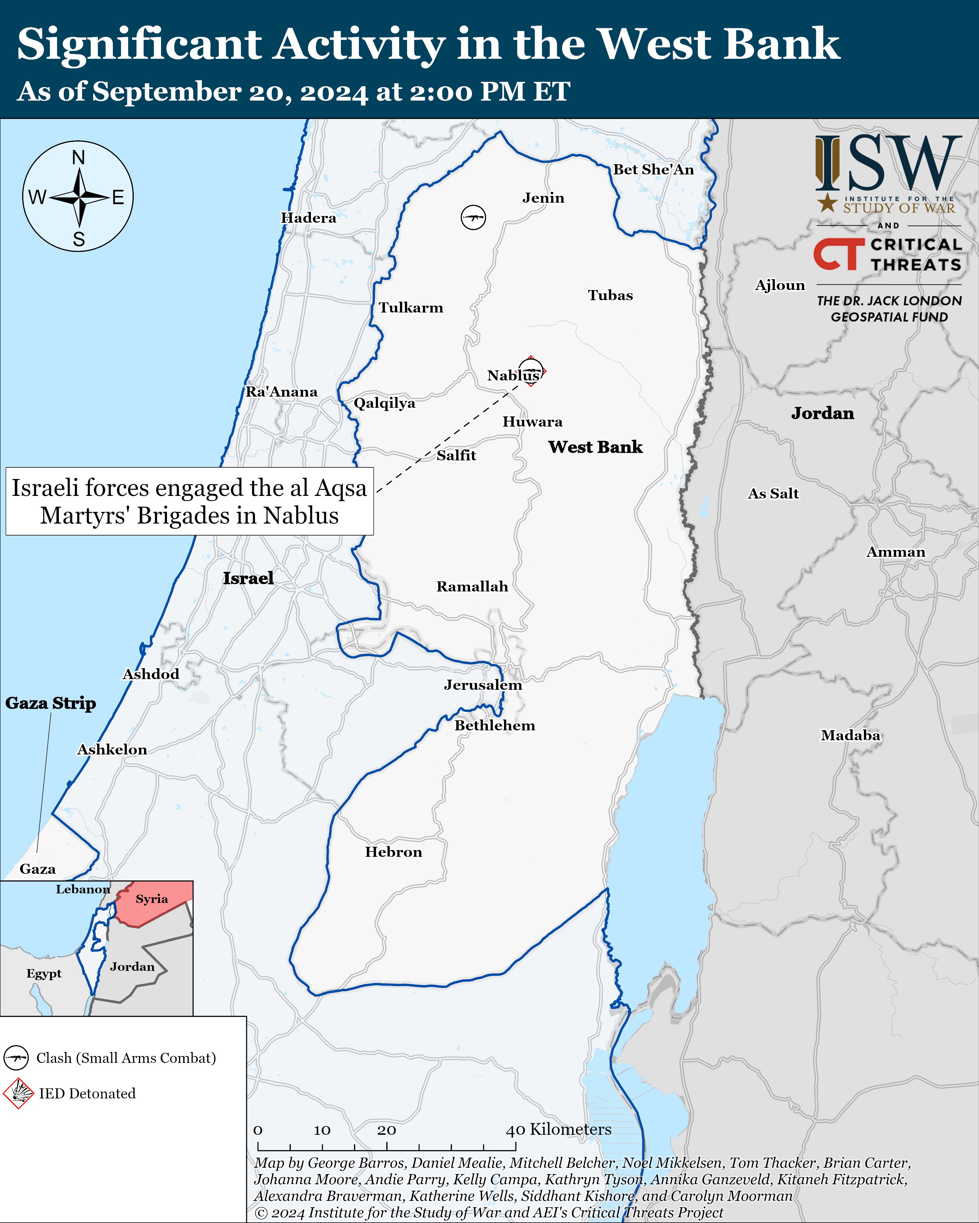 Israeli forces have engaged Palestinian fighters in at least two locations in the West Bank since CTP-ISW’s last data cutoff on September 19.[16] The al Aqsa Martyrs’ Brigades fired small arms and detonated improvised explosive devices (IED) targeting Israeli forces in Nablus.[17]