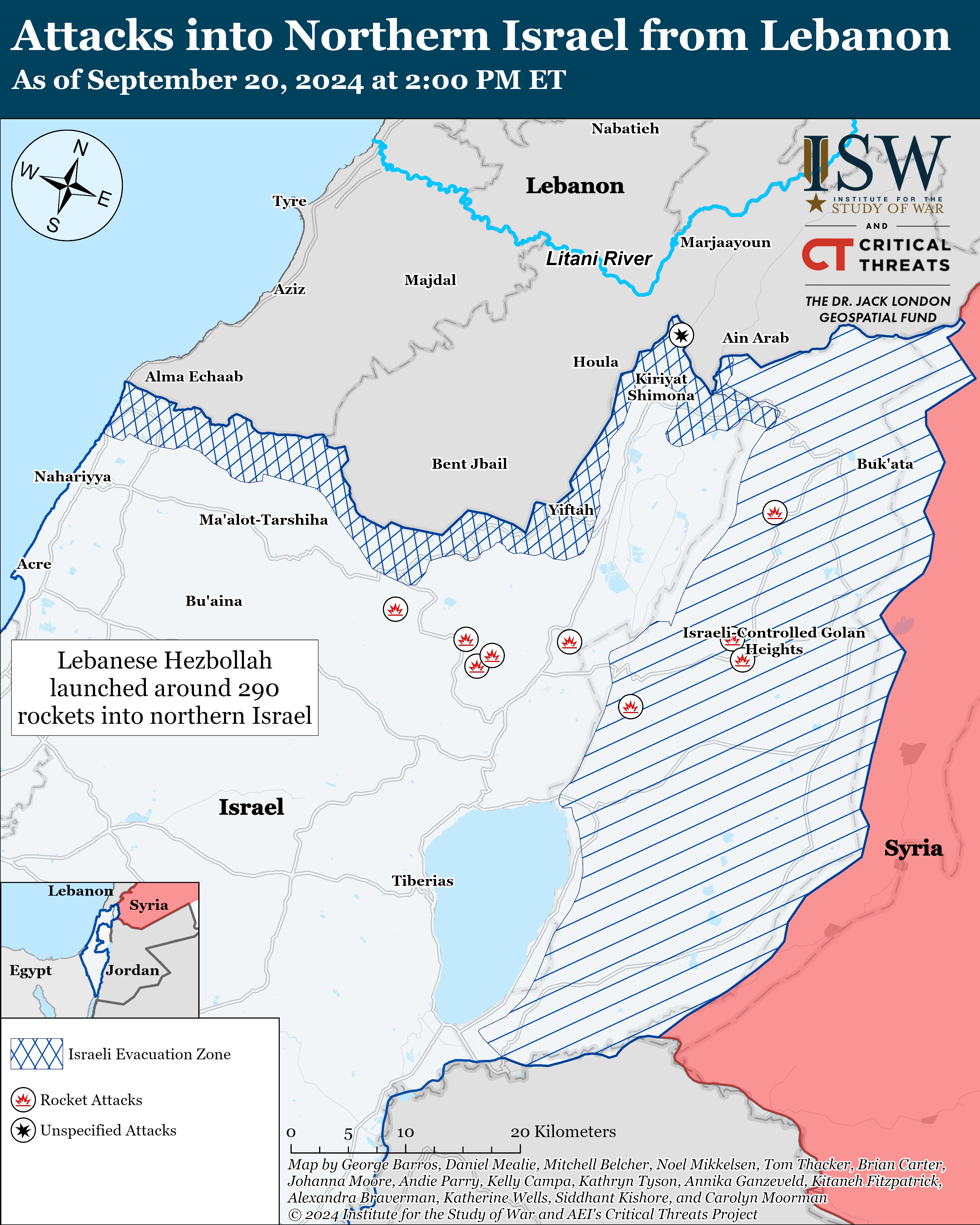 Lebanese Hezbollah has conducted at least 12 attacks into northern Israel since CTP-ISW’s last data cutoff on September 19.[20] Hezbollah launched approximately 290 rockets at Israeli military positions in retaliation for Israeli airstrikes in southern Lebanon.[21]