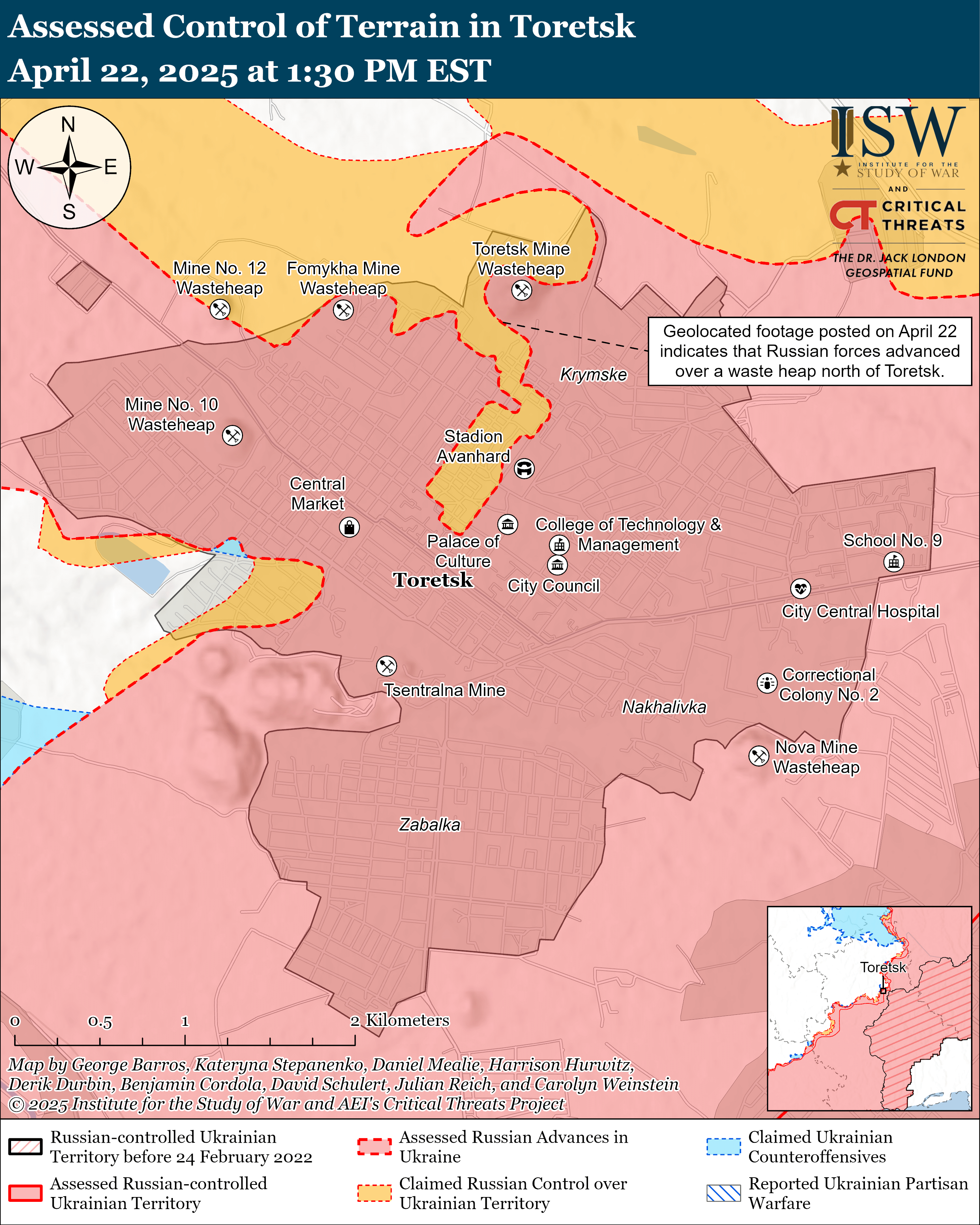Assessed Russian advances: Geolocated footage posted on April 22 indicates that Russian forces recently marginally in the waste heap area immediately north of Toretsk.[86]