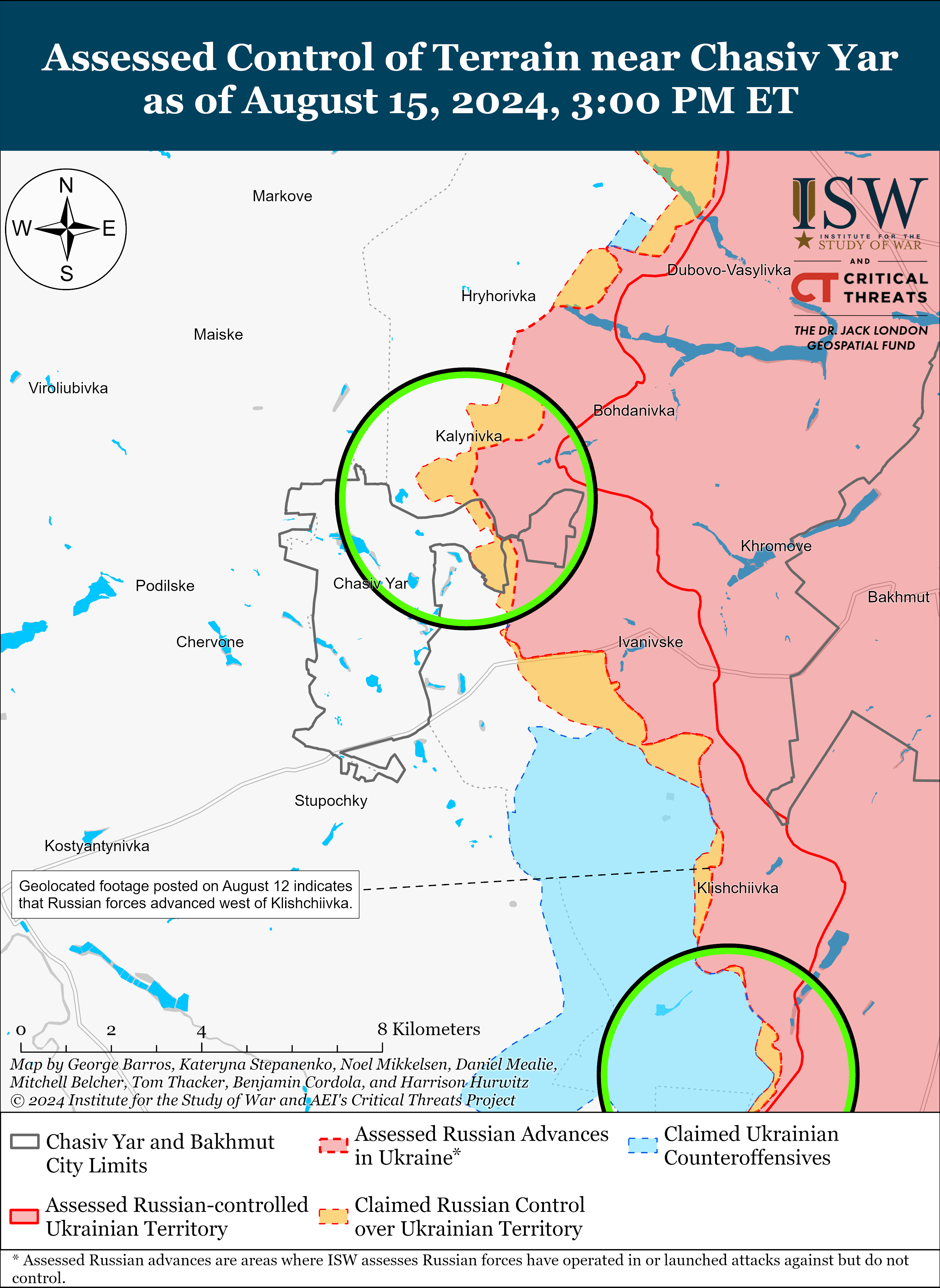 Russian forces continued offensive operations near Chasiv Yar on August 15, but there were no confirmed changes to the frontline. The Ukrainian General Staff reported that Russian forces conducted offensive operations near Chasiv Yar and southeast of Chasiv Yar near Andriivka on August 14 and 15.[68] A Russian milblogger claimed that Russian forces advanced southwest of Klishchiivka (southeast of Chasiv Yar), but ISW has not observed confirmation of this claim.[69]
