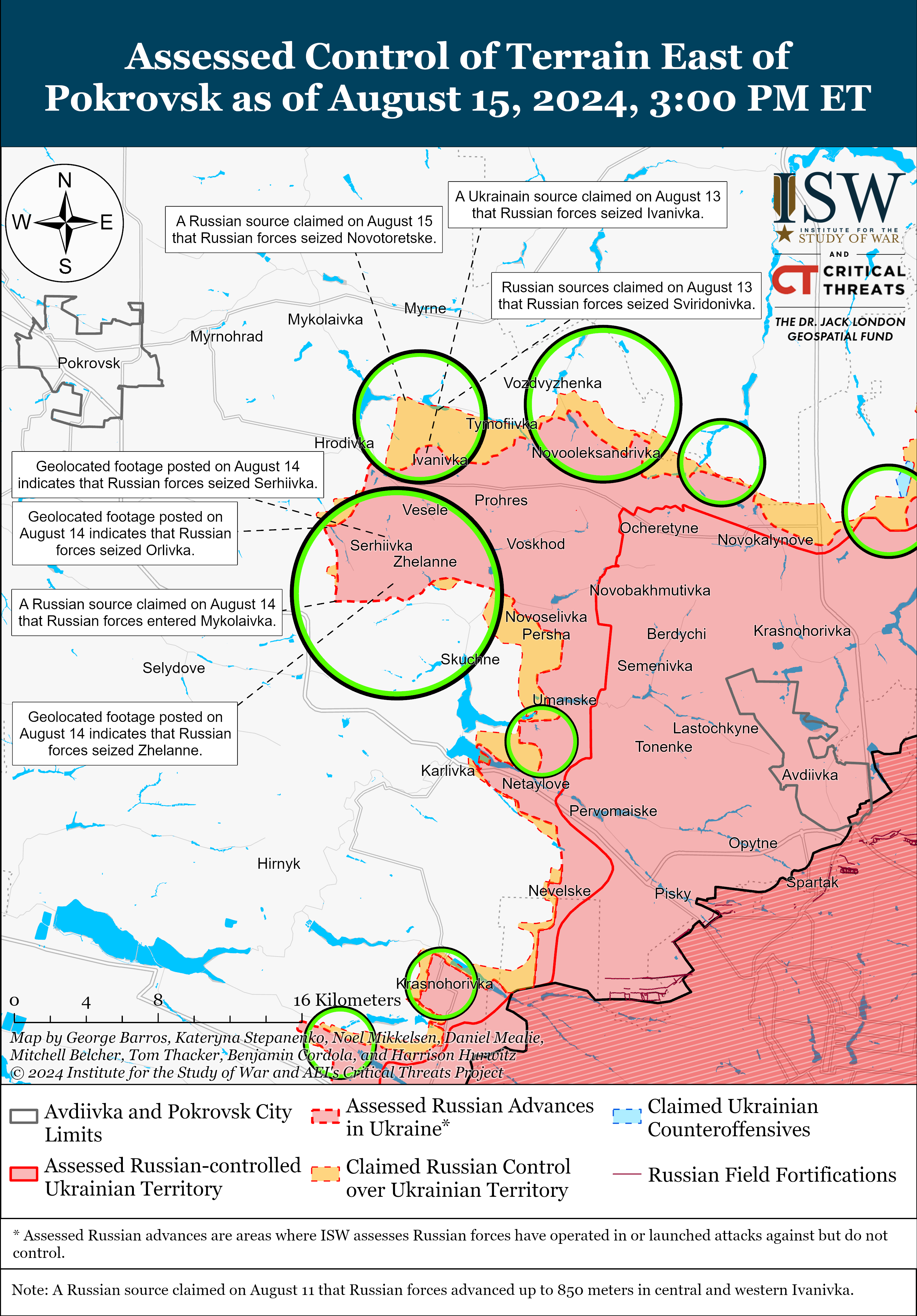 Russian forces continue to pursue a tactical encirclement of Ukrainian forces southeast of Pokrovsk and recently made confirmed advances in the area. Geolocated footage published on August 14 and 15 indicates that Russian forces recently advanced within Hrodivka (east of Pokrovsk), Mykolaivka, Zhelanne, and Orlivka (all southeast of Pokrovsk) and likely seized Zhelanne and Orlivka.[74] Russian sources claimed that Russian forces advanced near and within Zhuravka (southeast of Pokrovsk) and advanced a total of 5.24 kilometers wide along a 2.2 kilometers deep front in the Zhuravka-Orlivka-Mykolaivka-Zhelanne area.[75] The Russian Ministry of Defense (MoD) claimed that Russian forces seized Ivanivka (east of Pokrovsk), and ISW assessed that Russian forces seized the settlement as of August 13[76] Russian sources claimed that Russian forces also advanced towards Novohrodivka (southeast of Pokrovsk) and seized Novotoretske (east of Pokrovsk).[77] Russian forces conducted offensive operations northeast of Pokrovsk near Zelene Pole; east of Pokrovsk near Vozdvyzhenka, Kalynove, Novotoretske, Mykolaivka, Yelyzavetivka, and Hrodivka; and southeast of Pokrovsk near Novohrodivka, Skuchne, Orlivka, Yasnobrodivka, Ptychne, and Zhelanne on August 14 and 15.[78] A Ukrainian soldier operating in the Pokrovsk direction stated on August 15 that Russian forces have a 10-to-1 infantry advantage in the area and conduct infantry-led assaults from just before sunrise to just after sunset each day.[79] Another Ukrainian soldier stated that Russian forces are fewer than six kilometers from Selydove (southeast of Pokrovsk), which is consistent with ISW’s assessment of Russian advances in the area.[80]