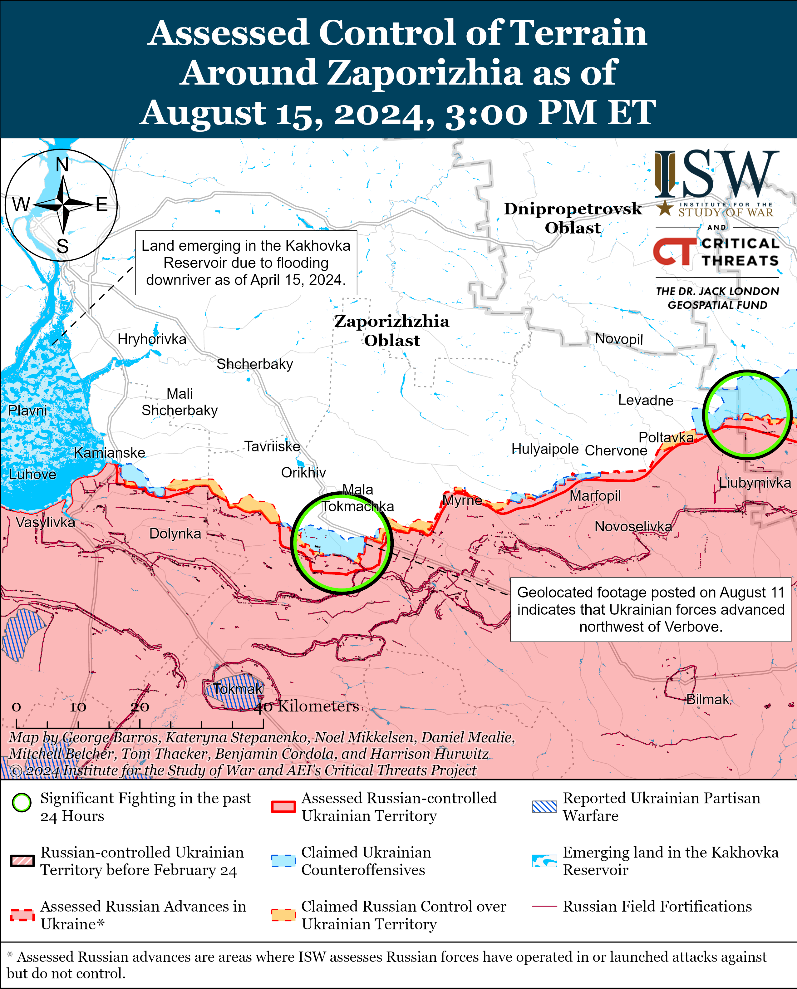 Ukrainian officials are taking steps to consolidate and coordinate the management of ongoing Ukrainian operations in Kursk Oblast while continuing to highlight Ukrainian advances. Ukrainian President Volodymyr Zelensky held a meeting with the Stavka (Ukrainian high command) on August 15 and heard reports from military leadership on the situation in Kursk Oblast.[1] Ukrainian Commander-in-Chief Colonel General Oleksandr Syrskyi announced to the Stavka that Ukraine has created a military commandant’s office in Kursk Oblast under the leadership of Major General Eduard Moskalyov to “maintain law and order and ensure the priority needs of the population.”[2] Ukrainian Ombudsman Dmytro Lubinets also stated on August 14 that Ukraine is prepared to coordinate prisoner of war (POW) exchanges with Russia and that he is communicating with his Russian counterpart about the possibility of exchanging “hundreds” of Russian POWs that Ukraine has reportedly captured since the beginning of the Kursk operation for Ukrainian POWs currently in Russian captivity.[3] Syrskyi also reported that since the beginning of the day on August 15, Ukrainian forces advanced between 500 meters and 1.5 kilometers in unspecified areas of Kursk Oblast and have advanced 35 kilometers deep since the beginning of the Ukrainian operation into Kursk Oblast on August 6.[4] ISW continues to assess that Ukrainian forces do not doctrinally control all the territory within the maximalist extent of claimed Ukrainian advances, but the creation of the commandant’s office will likely allow Ukrainian forces to coordinate military actions in the area that falls under maximal Ukrainian claims and safeguard the civilian population.[5]