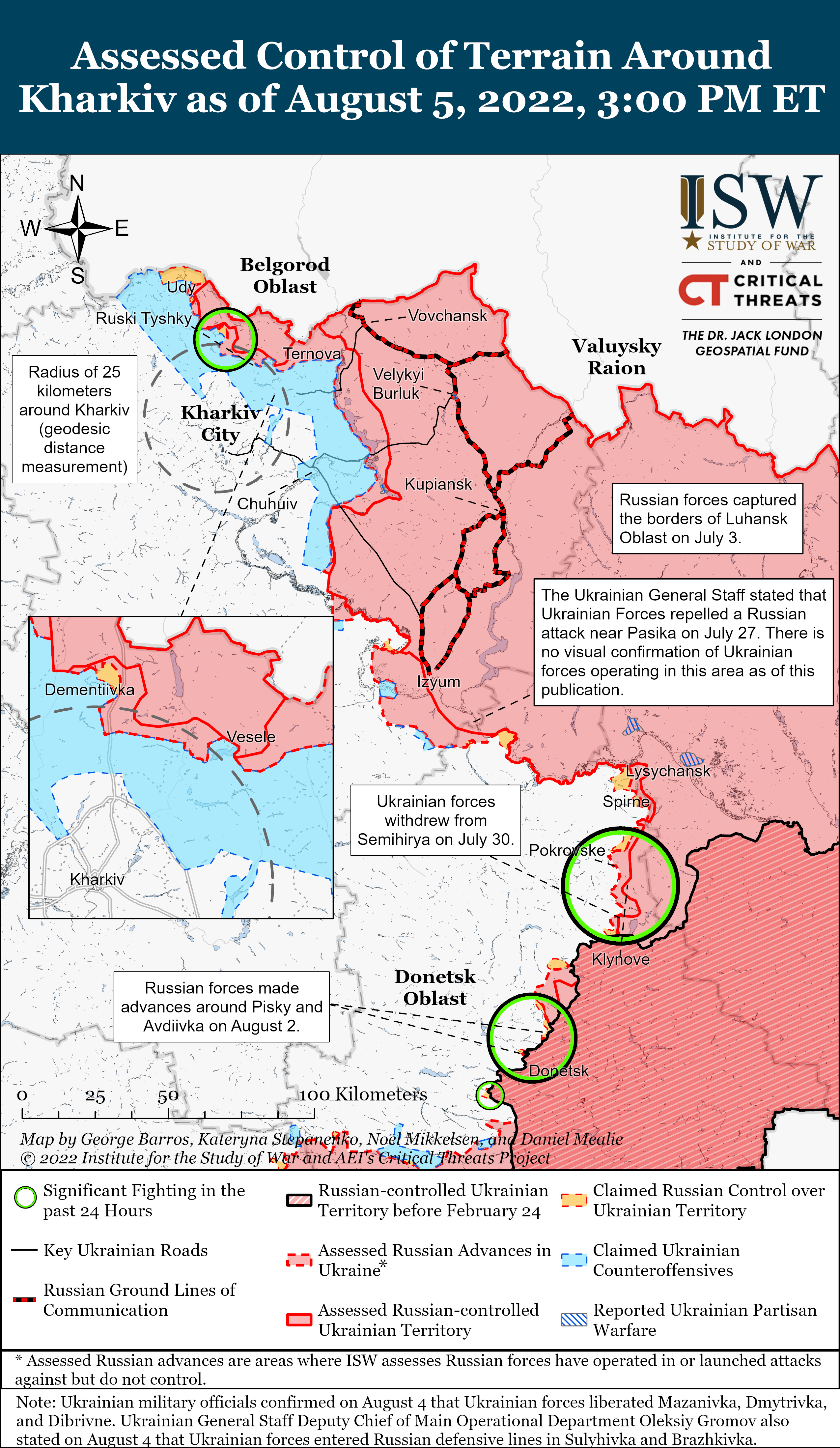 Russian forcescontinued to focus on preventing Ukrainian forces from creating conditions toresume a counteroffensive on the Kharkiv City Axis on August 5. Russian forcescontinued to conduct aerial reconnaissance and engage Ukrainian forces inpositional battles in settlements northwest of Kharkiv City but did not makeany territorial gains.[12] Russian forces continuedshelling Kharkiv City and settlements to the northeast, northwest, andsoutheast.[13]