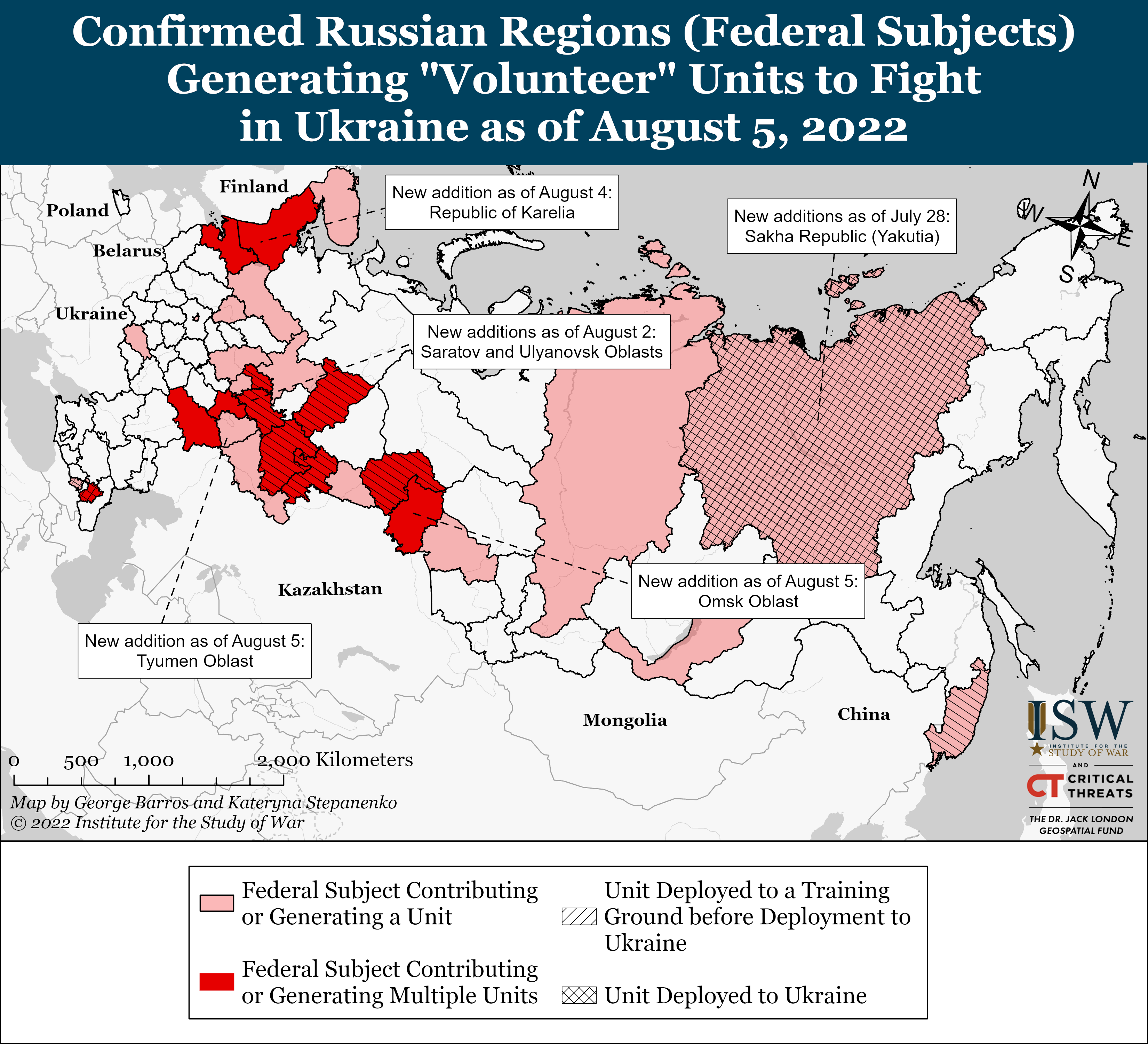 Russian federal subjects(regions) continued to form regionally-based volunteer battalions. Omsk Oblast Governor Aleksandr Butkov reported on August 5 that Omsk Oblast is continuing to form three volunteer battalions – “Irtysh,” “Avangard,” and “Om”- to deploy to Donbas to provide engineering, medical and logistical support.[31] Butkov stated that Omsk Oblast will provide a one-time payment of 100,000 rubles(approximately $1,612) to recruits but specified that the funds will only be accessible after three months of service.[32]Omsk Oblast news outlet BK55 reported that recruits will receive a monthly salary is 40,000 to 50,000 (approximately $661-$826) that will increase to 130,000 (approximately $2,147) once they enter the territory of Ukraine.[33]