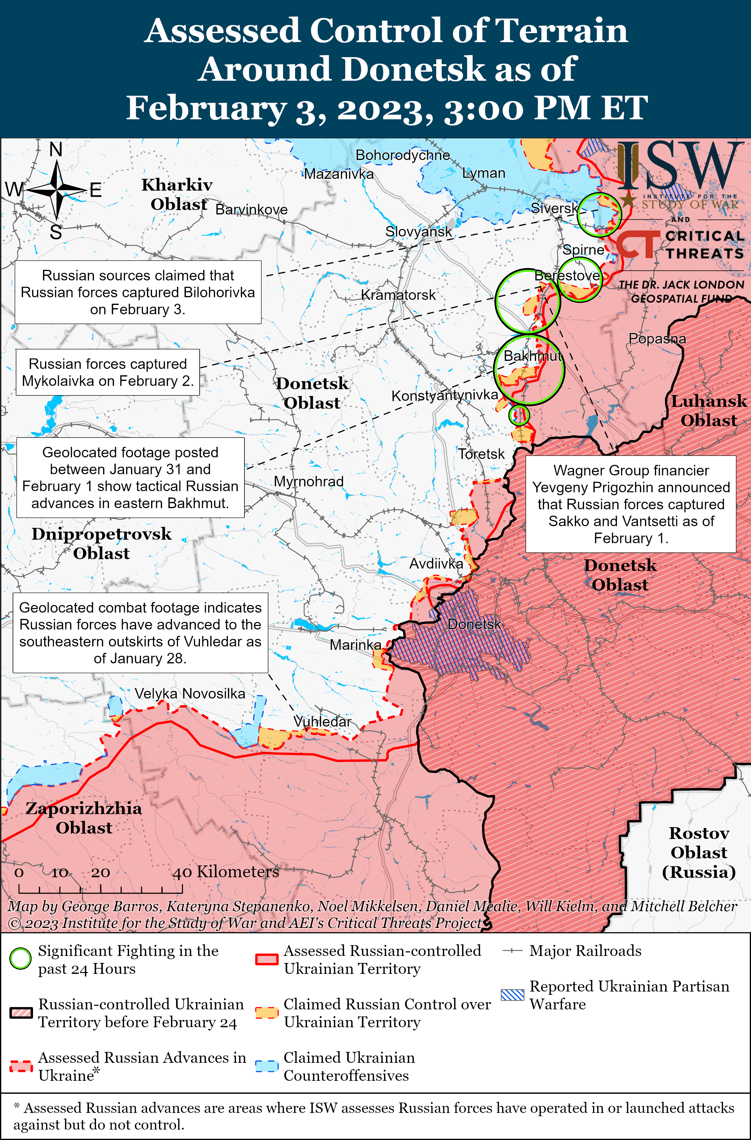 Russian forces continued ground attacks around Bakhmut on February 3. The Ukrainian General Staff reported that Ukrainian troops repelled Russian attacks on Bakhmut itself; northeast of Bakhmut near Verkhnokamianske, Mykolaivka, Krasna Hora, and Paraskoviivka; and southwest of Bakhmut near Ivanivske and Kurdiumivka.[31] Ukrainian Eastern Group of Forces spokesperson Serhiy Cherevaty stated on February 3 that Russian and Ukrainian forces engaged in 23 combat clashes in the Bakhmut area over the course of a day.[32] Geolocated footage posted on February 2 confirms that Russian troops have advanced on the eastern outskirts of Bakhmut.[33] A Russian milblogger claimed that Wagner Group forces have expanded their control near the Siniat Plant in eastern Bakhmut.[34] Russian sources additionally continued to discuss purported Wagner advanced northeast of Bakhmut in the Mykolaivka-Rozdolivka area about 15km north of Bakhmut.[35] Former militant commander and convicted war criminal Igor Girkin noted that Russian operations northeast of Bakhmut are directed at developing an offensive towards Siversk (30km north of Bakhmut).[36] Russian milbloggers claimed that Wagner troops southwest of Bakhmut are continuing efforts to advance from the Klishchiivka area towards Ivanivske (5km west of Bakhmut) in order to cut the T0504 Kostyantynivka-Chasiv Yar-Bakhmut highway.[37]