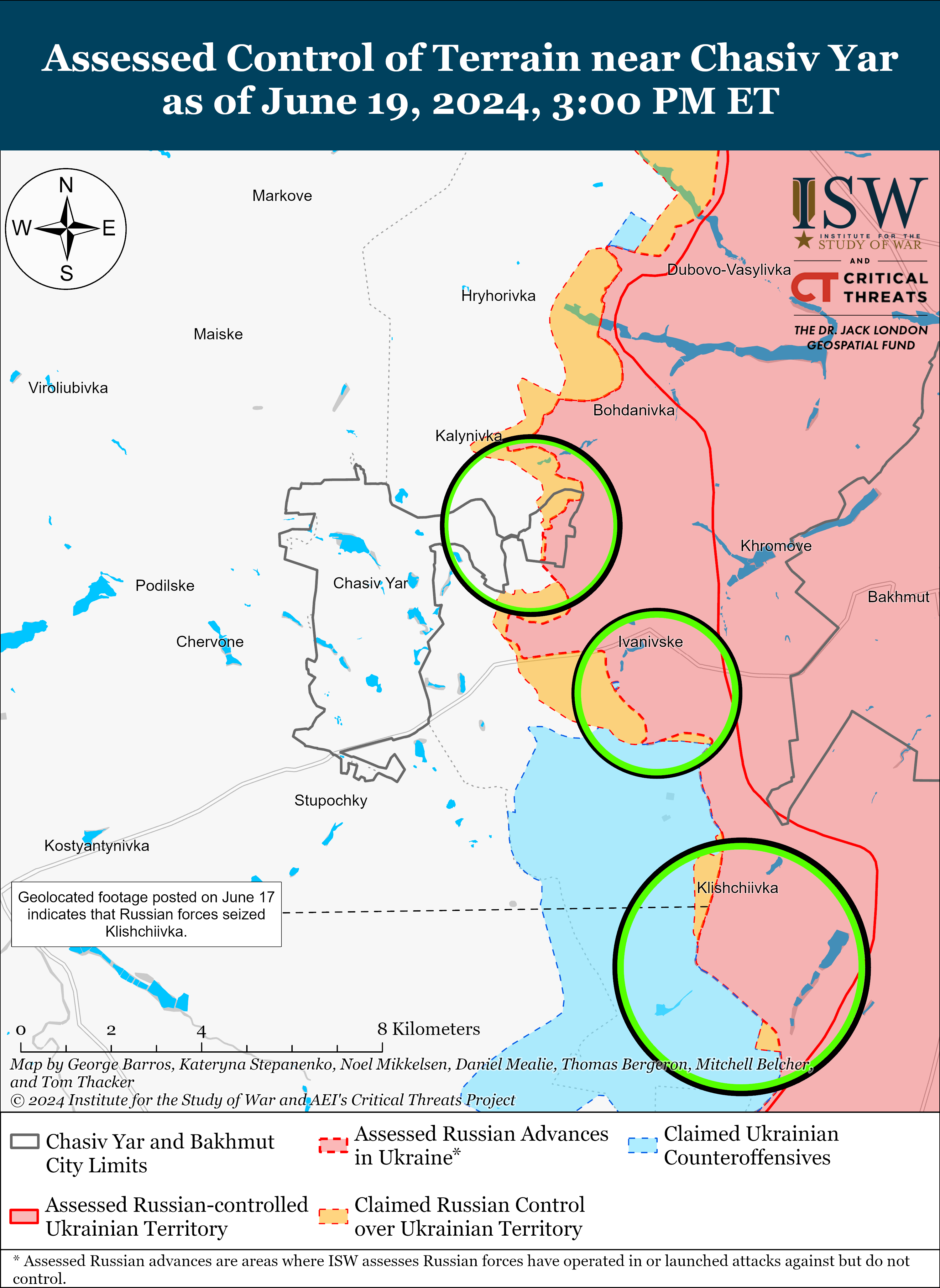 Russian forces recently marginally advanced northeast of Chasiv Yar and continued offensive operations in the area on June 18 and 19. Geolocated footage published on June 19 shows that Russian forces marginally advanced in central Kalynivka (north of Chasiv Yar), and Russian milbloggers similarly claimed that Russian forces made unspecified advances in the settlement.[57] Russian forces reportedly launched assaults in easternmost Chasiv Yar in the Novyi Microraion and near Kanal Microraion; north of Chasiv Yar near Kalynivka; northeast of Chasiv Yar near Bohdanivka; and southeast of Chasiv Yar near Ivanivske, Klischiivka, and Andriivka on June 18 and 19.[58] Elements of the Russian 98th VDV Division are operating near Kanal Microraion; and elements of the Russian 58th Spetsnaz Battalion (1st Donetsk People’s Republic [DNR] AC) are operating in the Chasiv Yar direction.[59]