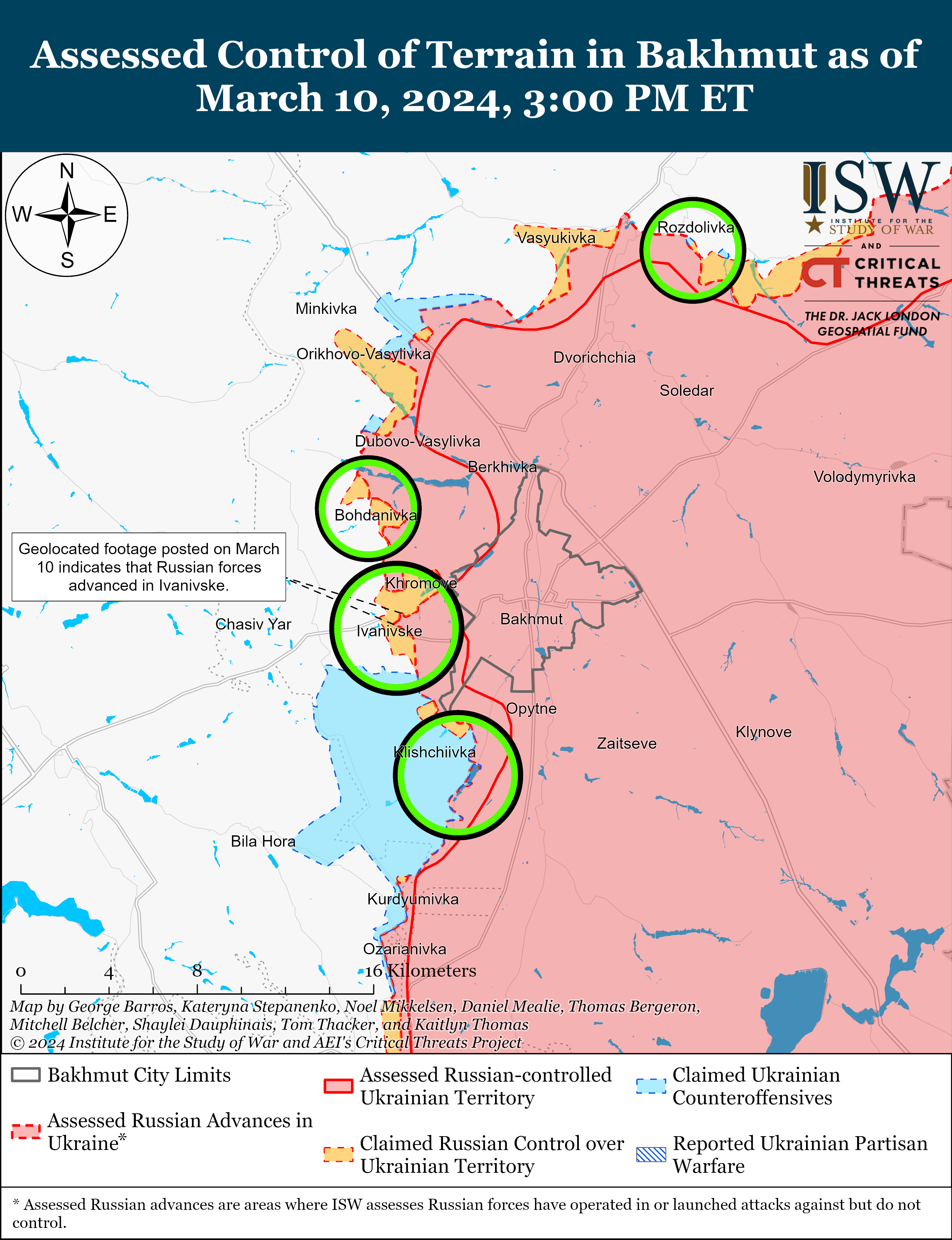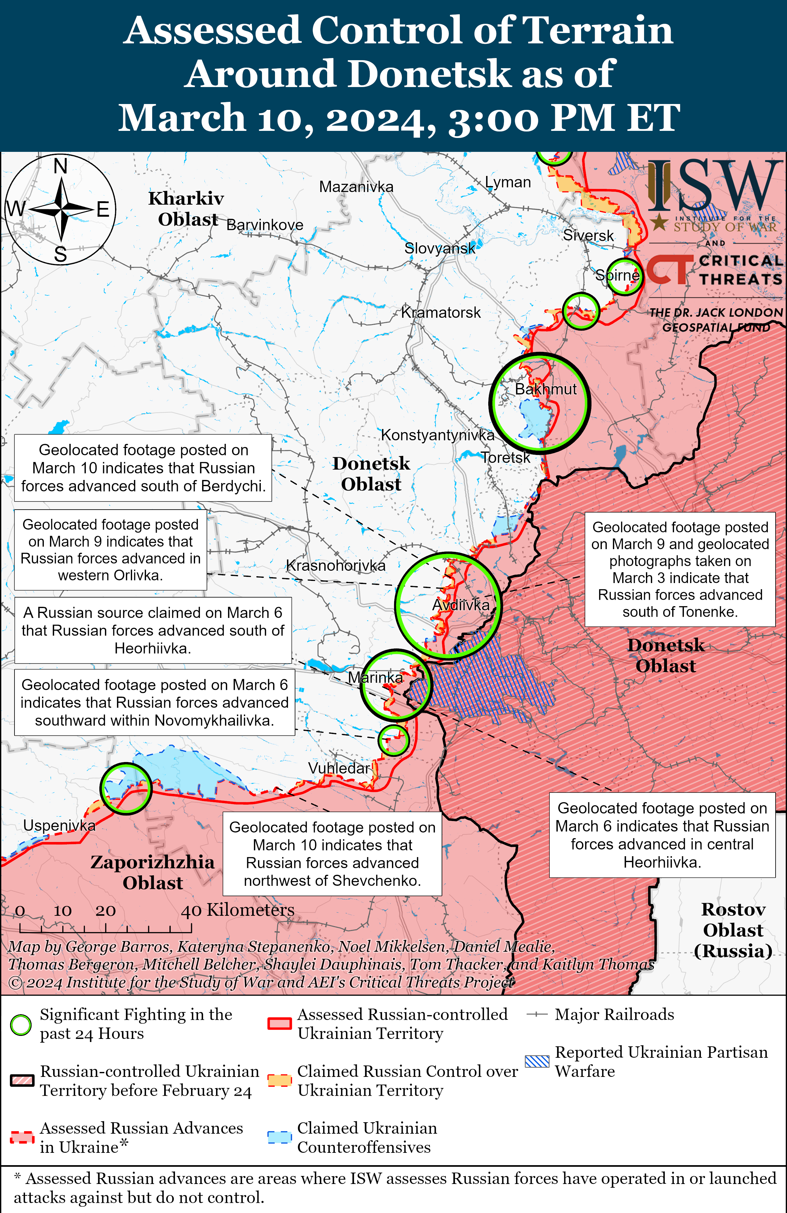 - Russian forces recently made confirmed advances near Bakhmut and Avdiivka amid continued positional engagements along the entire frontline on March 10.
