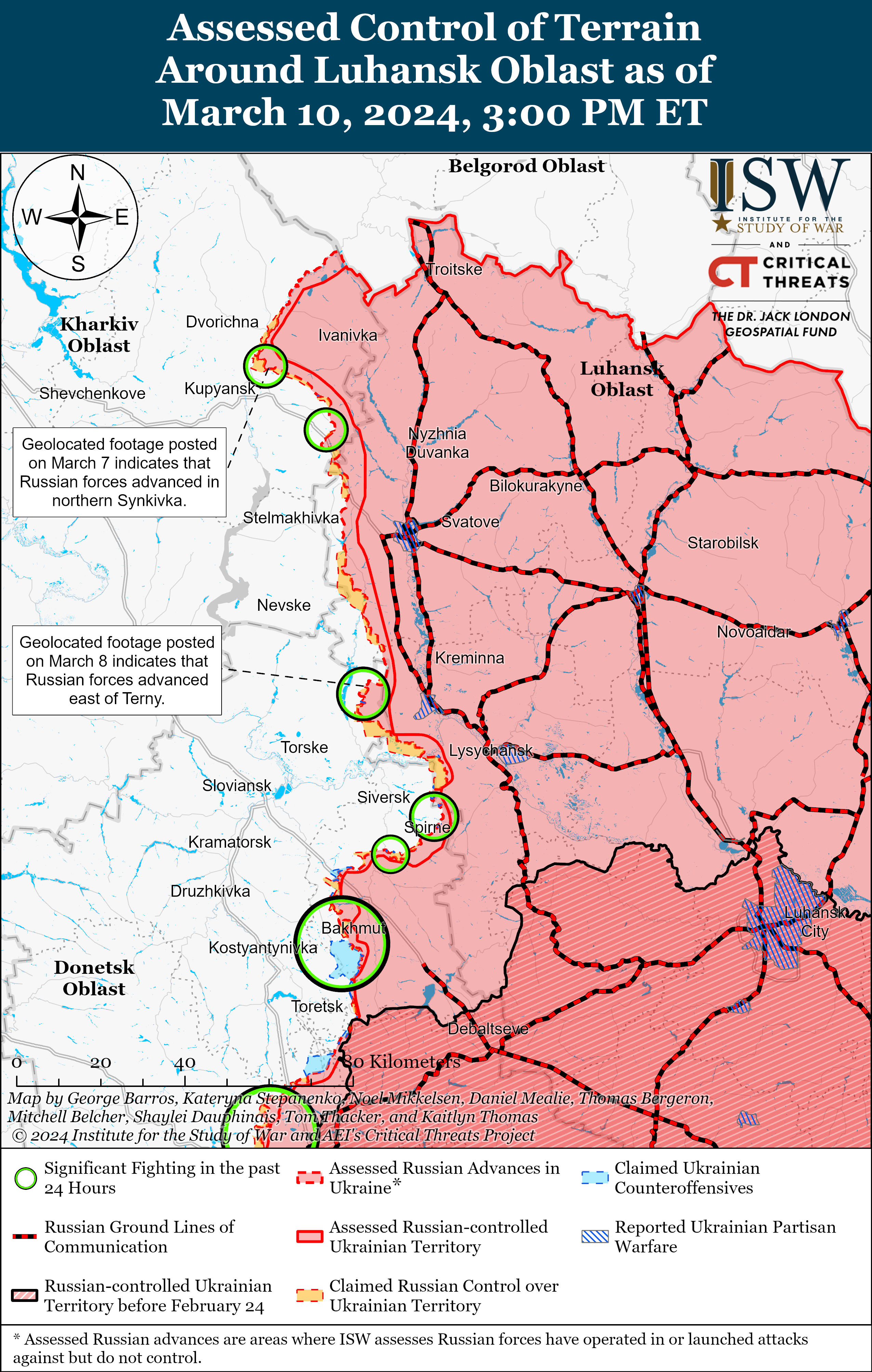 Positional engagements continued northeast of Kupyansk and near Kreminna on March 10, but there were no confirmed changes to the frontline. Positional engagements continued northeast of Kupyansk near Synkivka, west of Kreminna near Yampolivka and Terny, and south of Kreminna near Bilohorivka (12km south of Kreminna).[34]