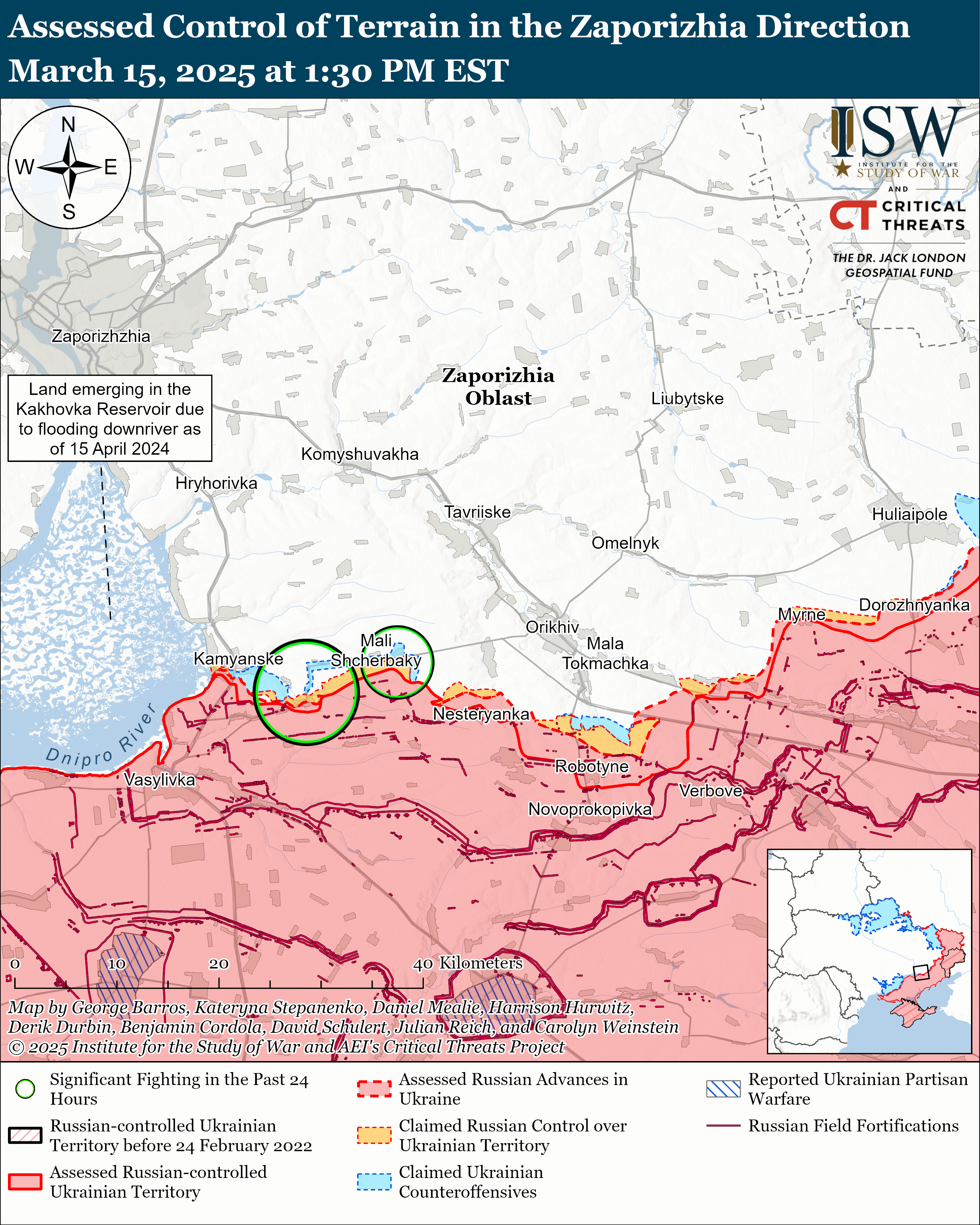 Russian milbloggers and Ukrainian officials continue to deny Russian President Vladimir Putin’s unsubstantiated claim that Russian forces have encircled a significant number of Ukrainian troops in Kursk Oblast. Russian milbloggers published maps on March 14 and 15 showing Russian and Ukrainian positions in Kursk Oblast that do not indicate Russian forces have encircled Ukrainian forces, and two Russian milbloggers explicitly denied Putin’s claim that Russian forces encircled a significant number of Ukrainian forces in the area on March 13 and 14.[1] One milblogger characterized Putin’s claims as a narrative intended to influence US President Donald Trump ahead of peace negotiations.[2] Ukrainian President Volodymyr Zelensky noted that Russian forces are unsuccessfully attempting to encircle Ukrainian forces in Kursk Oblast, that no encirclement currently exists, and stated that Putin is attempting to delay discussion of the US-Ukrainian 30-day ceasefire proposal by spreading these claims.[3] Independent Ukrainian sources also denied Putin’s claims about Russian encirclements of Ukrainian forces and noted that Ukrainian forces maintain the ability to maneuver from their remaining positions in Kursk Oblast despite a difficult tactical situation.[4] ISW has still not observed any Russian milblogger claims or geolocated footage suggesting that Russian forces have encircled Ukrainian troops in Kursk Oblast. Ukrainian forces appear to maintain egress routes across the international border from their positions in Kursk Oblast as of this publication.