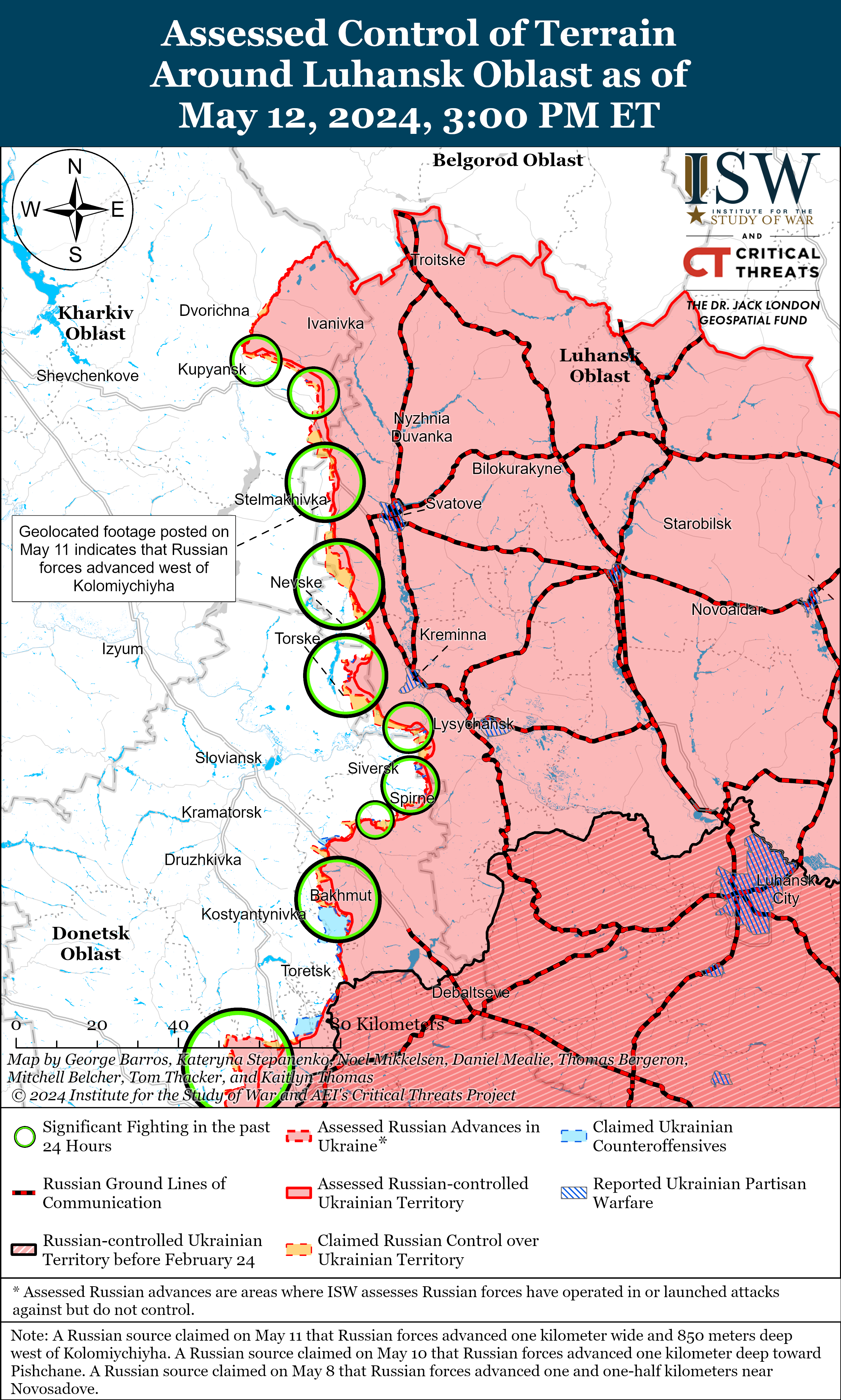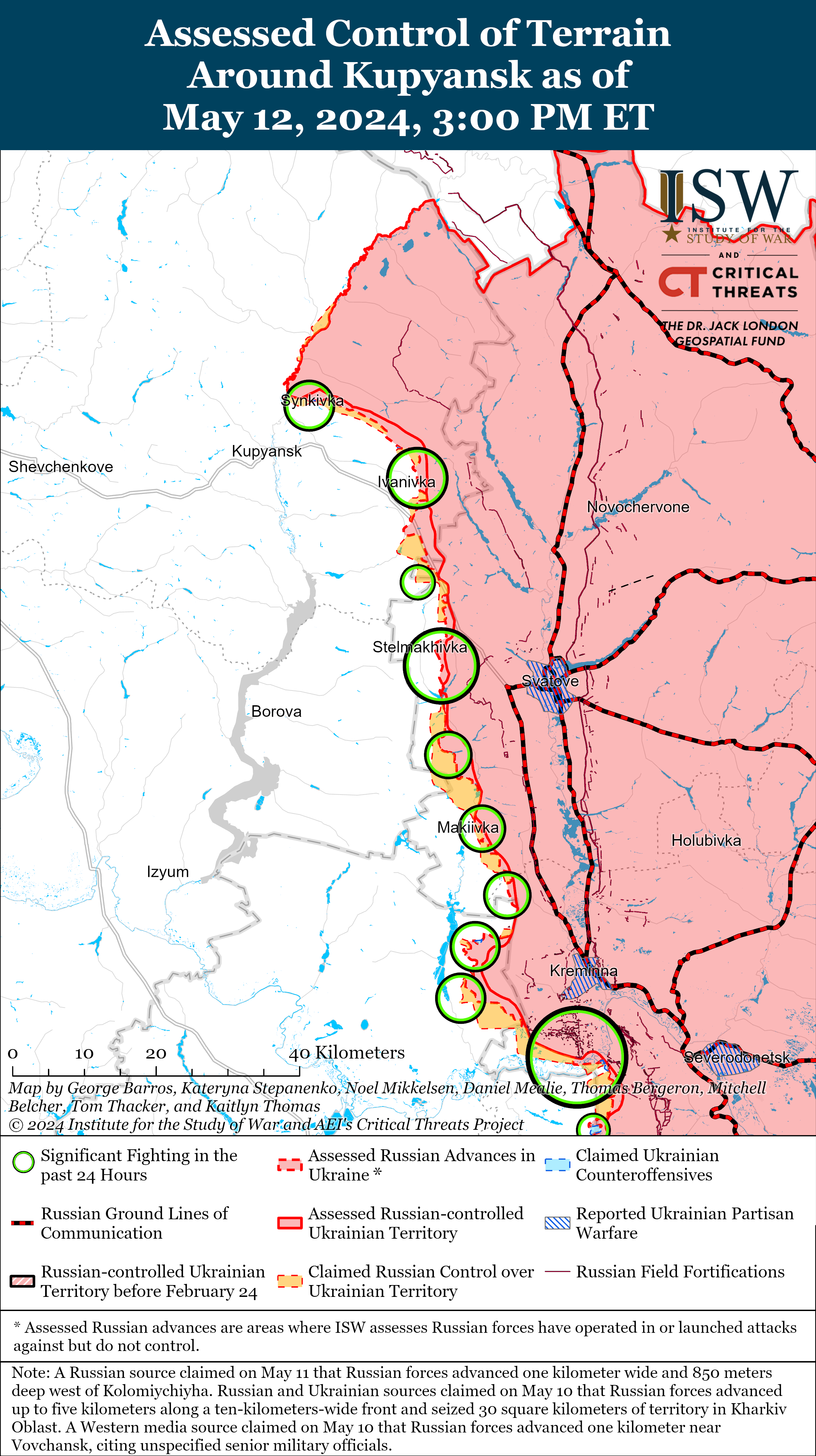 Russian forces continued ground attacks along the Kupyansk-Svatove-Kreminna line on May 12, but there were no confirmed changes to the frontline. Russian forces continued ground assaults northeast of Kupyansk near Synkivka; east of Kupyansk near Petropavlivka; northwest of Svatove near Ivanivka, Berestove, and Stelmakhivka; west of Svatove near Andriivka; southwest of Svatove near Novoyehorivka and Makiivka; northwest of Kreminna near Nevske; west of Kreminna near Terny and Novosadove; and south of Kreminna near the Serebryanske forest area and Bilohorivka.[58]