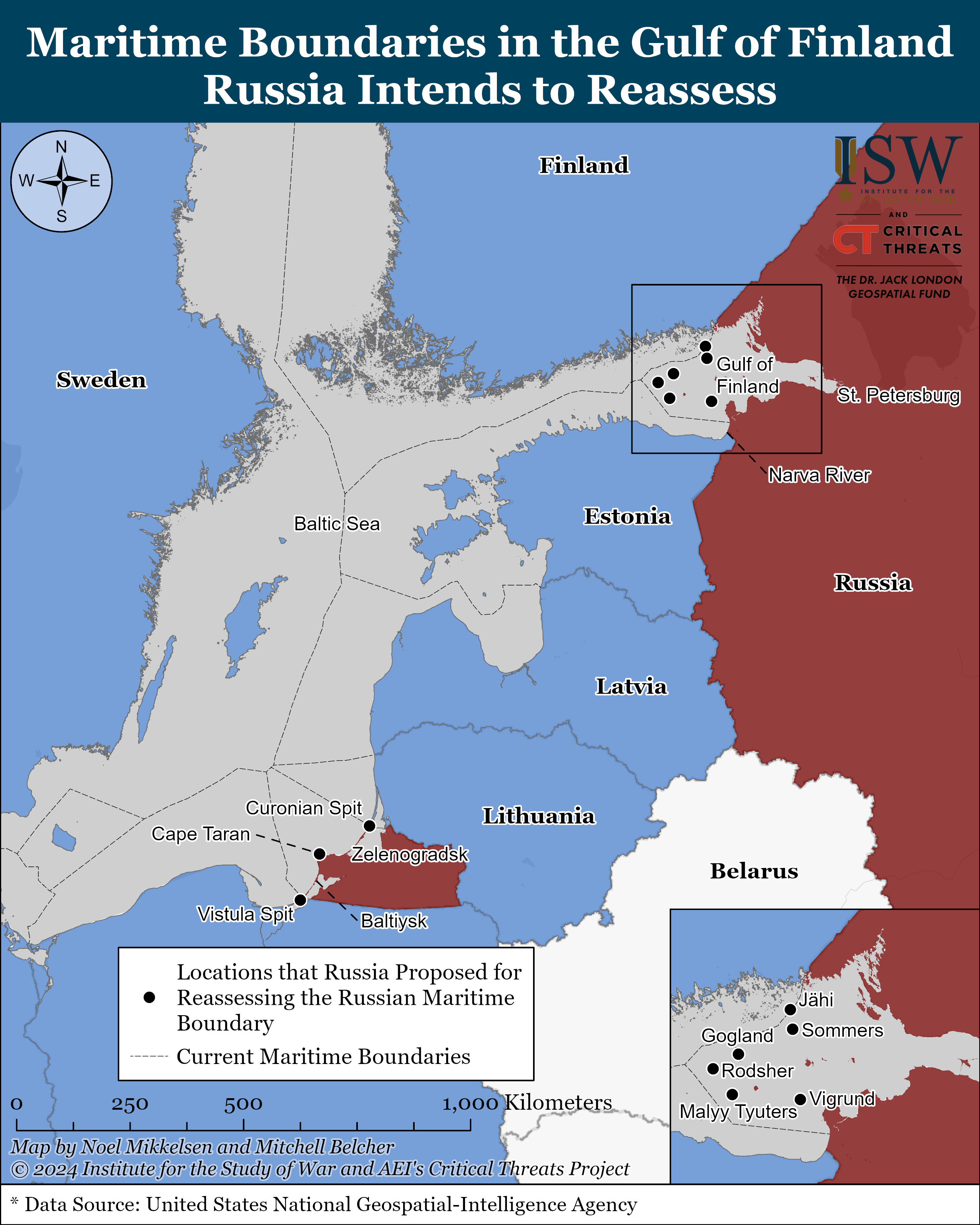 The Russian Ministry of Defense (MoD) proposed on May 21 that the Russian government reassess Russia’s maritime borders in the Baltic Sea so that these borders “correspond to the modern geographical situation.”[1] The Russian MoD produced a since-deleted document, which appeared on the Russian government’s legal portal on May 21, proposing that the Russian government should reassess the 1985 maritime borders in the Gulf of Finland because these borders were based on outdated “small-scale nautical navigation maps” developed in the mid-20th century.[2] The document proposed to partially recognize the 1985 resolution as “defunct.” The document suggested that the Russian government should adjust the maritime border coordinates in the Gulf of Finland in the zone of Jähi, Sommers, Gogland, Rodsher, Malyy Tyuters, and Vigrund islands and near the northern delta of the Narva River. The document also proposed that the Russian government revise the area of the Curonian Spit, Cape Taran, a cape south of Cape Taran, and the Vistula Spit in the Baltic Sea. Sommers, Gogland, Rodsher, Malyy Tyuters, and Vigrund island are under Russian control, while Russia and Finland split control over the Jähi island. The northern delta of the Narva River is located between Russia and Estonia, while the Curonian Spit leads to the international border between Russia and Lithuania. The Vistula Spit (also known as the Baltic Spit in Russia) is split between Kaliningrad Oblast, Russia and Poland, and Cape Taran is just northwest of Kaliningrad City. The document stated that these proposed changes would establish a system of baselines for maritime borders on the southern part of the Russian islands in the eastern part of Gulf of Finland as well as in the areas of Baltiysk and Zelenogradsk, both in Kaliningrad Oblast. The document also noted that these changes will allow Russia to use corresponding water areas as Russian internal sea waters, and that the line of the Russian state border will shift due to the changes in the position of the external border of the territorial sea.