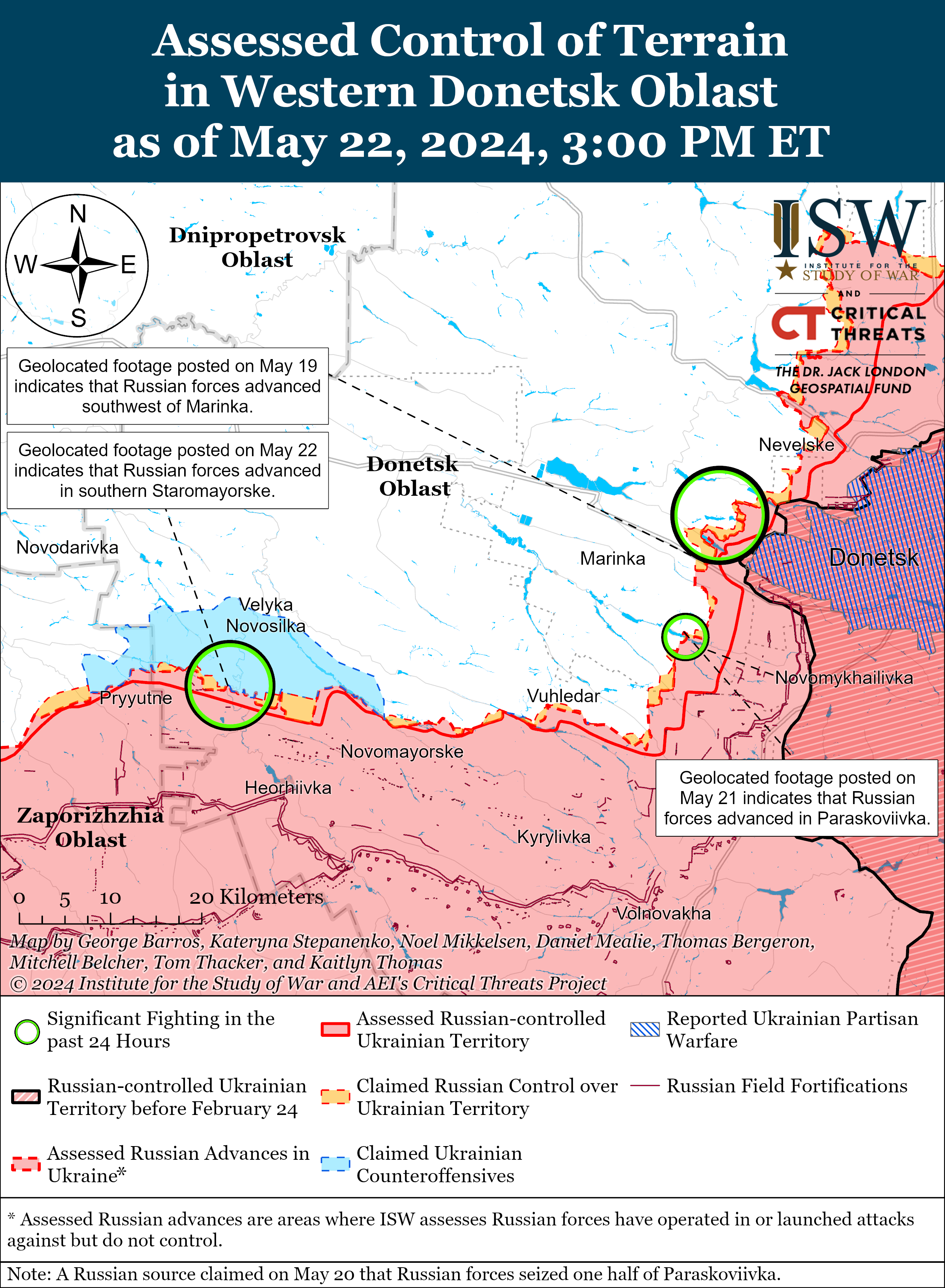 Russian forces recently made marginal gains southwest of Donetsk City. Geolocated footage published on May 21 indicates that Russian forces recently marginally advanced southwest of Novomykhailivka (southwest of Donetsk City).[65] A Russian milblogger claimed on May 22 that Russian forces advanced further into Paraskoviivka (southwest of Donetsk City), although ISW has not observed evidence of this claim.[66] Russian forces continued offensive operations west of Donetsk City near Krasnohorivka and Heorhiivka and southwest of Donetsk City near Novomykhailivka, Pobieda, Paraskoviivka, Kostyantynivka, and Volodymyrivka on May 22.[67]