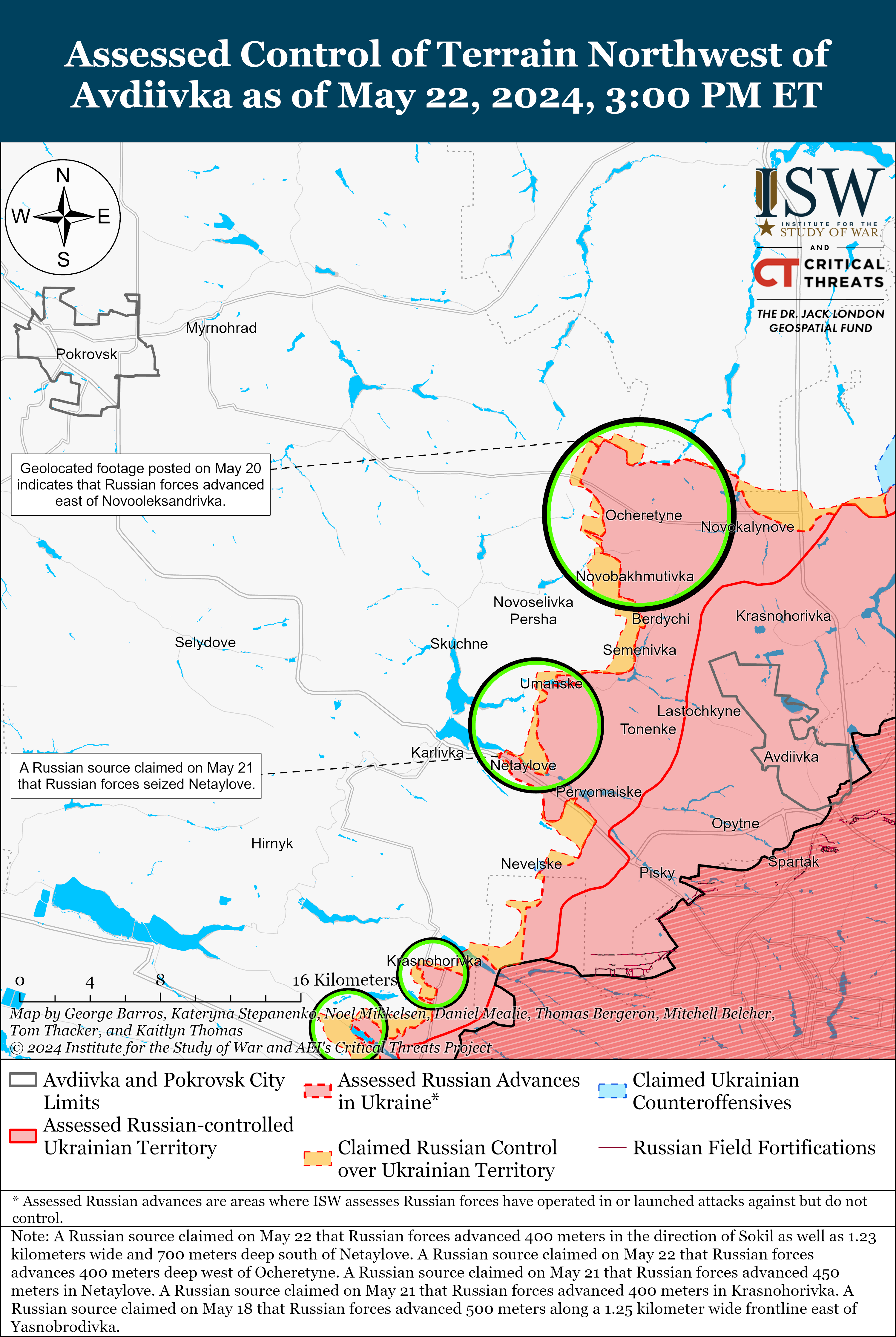 - Ukrainian forces recently recaptured territory near Vovchansk and Chasiv Yar, and Russian forces recently marginally advanced near Vovchansk, Avdiivka, Donetsk City, and Velyka Novosilka.