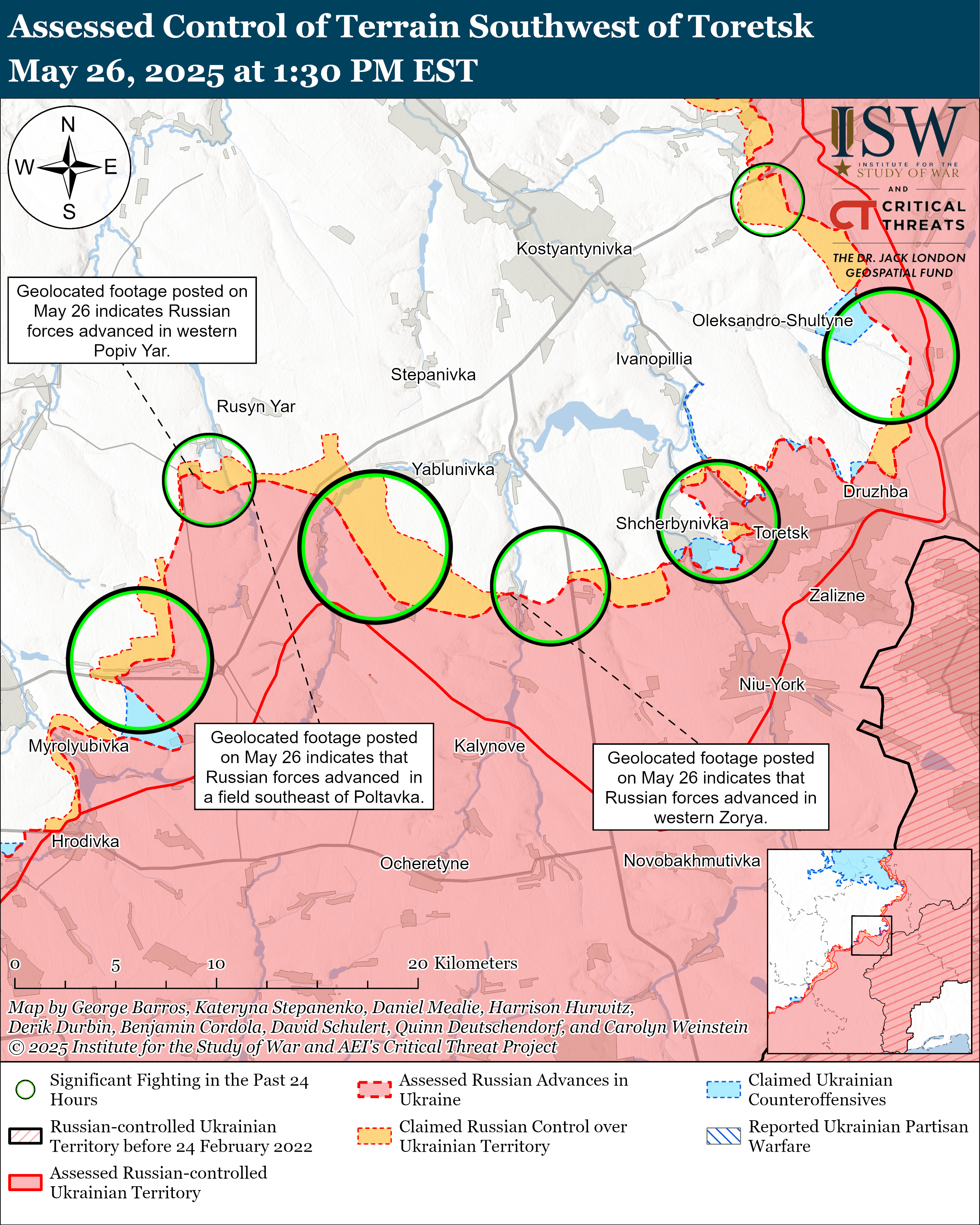Assessed Russian advances: Geolocated footage published on May 26 indicates that Russian forces recently marginally advanced to central Popiv Yar and in the fields southeast of Poltavka (both west of Toretsk).[71] Additional geolocated footage published on May 26 shows Russian forces engaging with civilians in Zorya (southwest of Toretsk), including that Russian forces have likely seized the settlement and that Ukrainian forces are not contesting the settlement.[72]