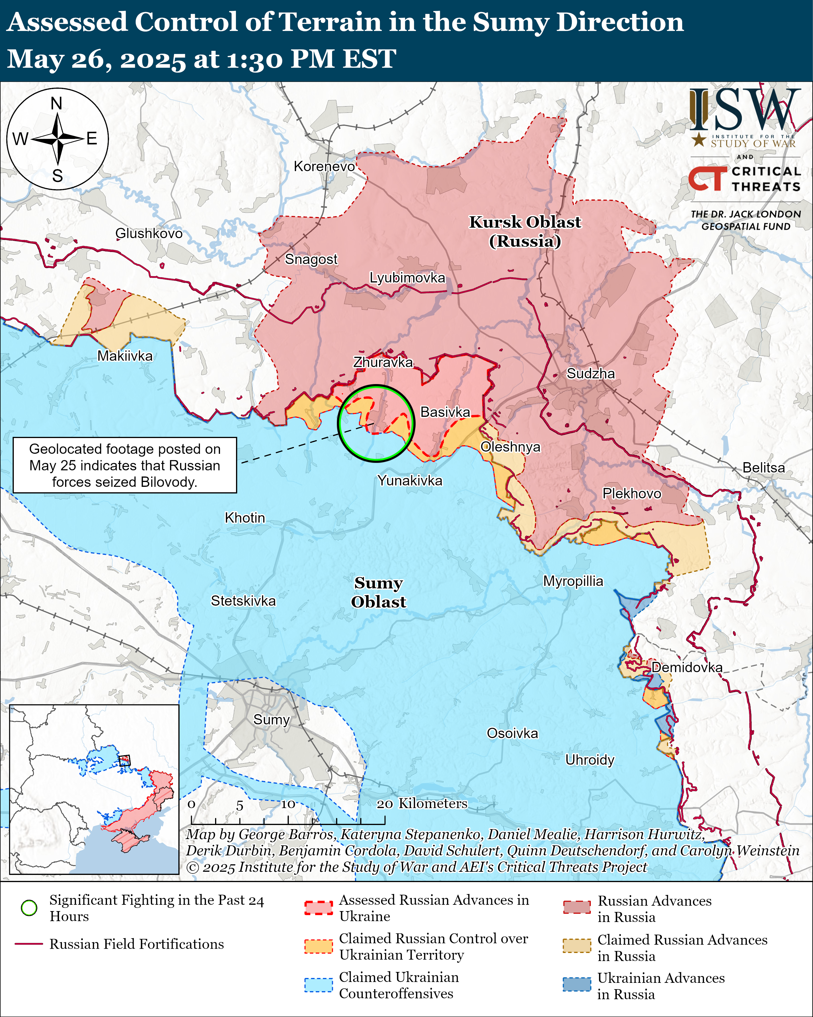 Assessed Russian advances: Geolocated footage published on May 25 indicates that Russian forces, reportedly elements of the Russian 83rd Airborne (VDV) Brigade, advanced into southern Bilovody (northeast of Sumy City) and likely seized the settlement.[44]