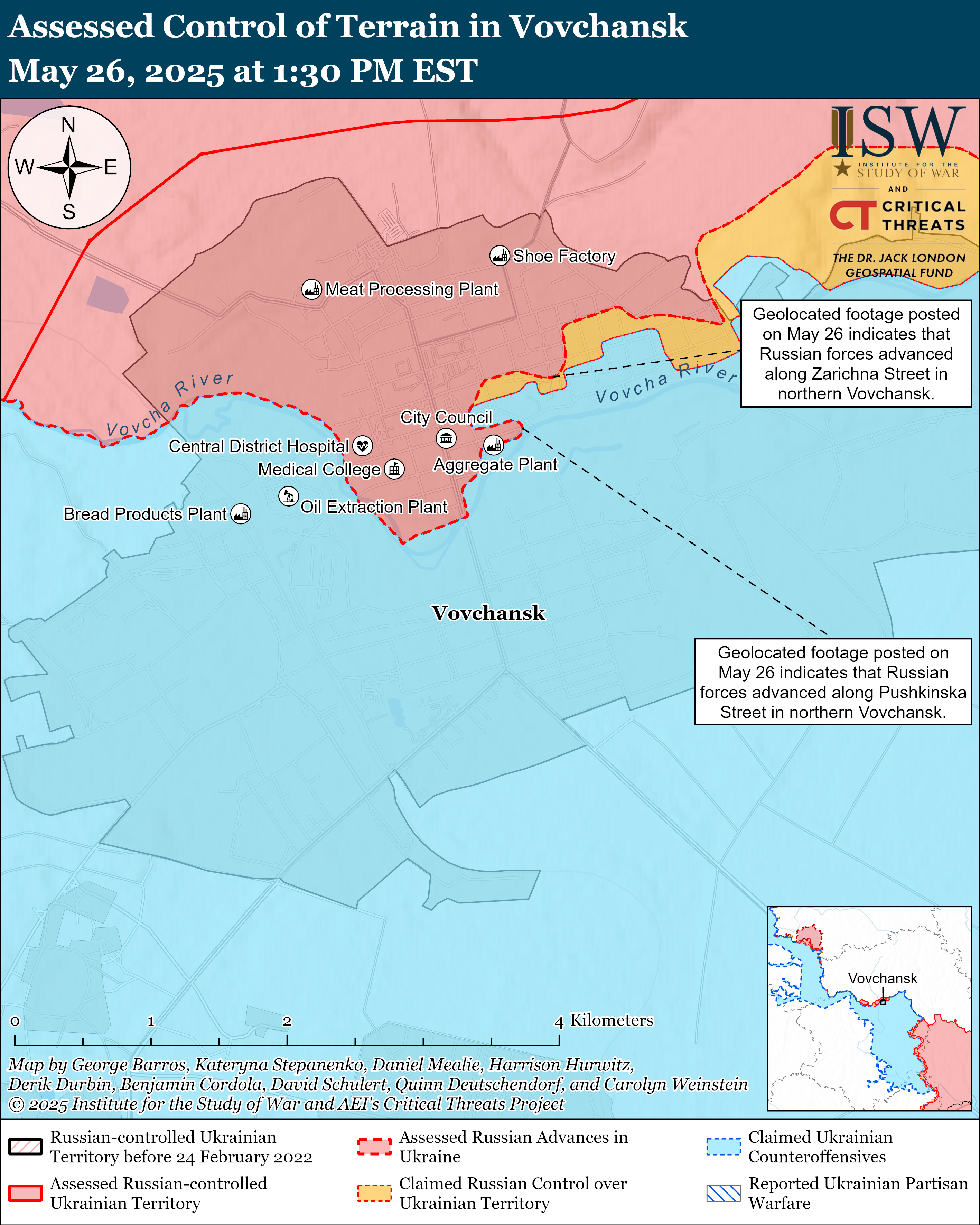Assessed Russian advances: Geolocated footage published on May 26 indicates that Russian forces recently advanced in northern Vovchansk (northeast of Kharkiv City) and likely seized the Vovchansk Aggregate Plant.[52]