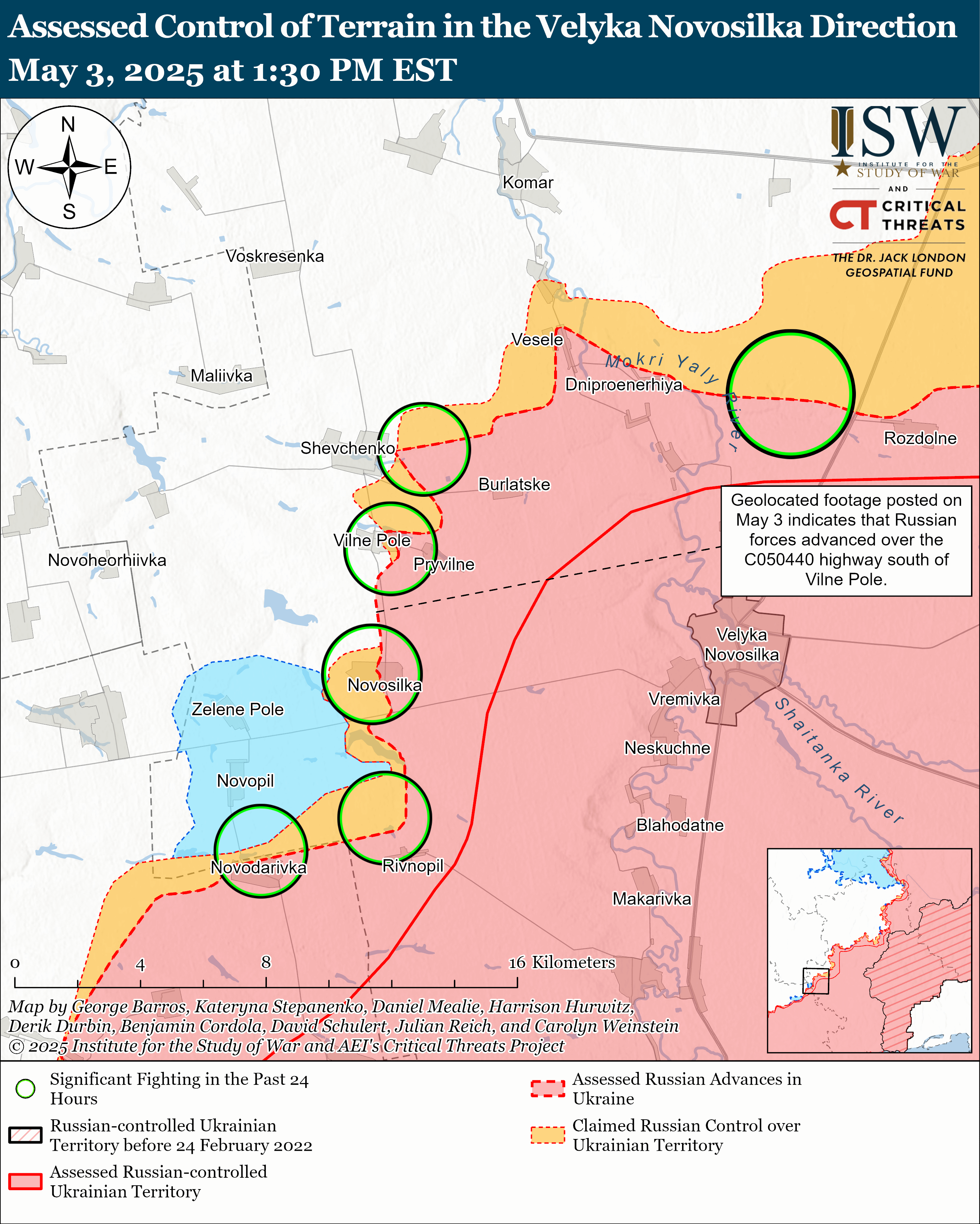 Russian forces conducted offensive operations northwest of Velyka Novosilka near Pryvilne, Burlatske, and Shevchenko; west of Velyka Novosilka near Novosilka and toward Zelene Pole; and southwest of Velyka Novosilka near Rivnopil and toward Novopil on May 2 and 3.[67] A Russian milblogger claimed that Ukrainian forces counterattacked near Vilne Pole and Shevchenko.[68]