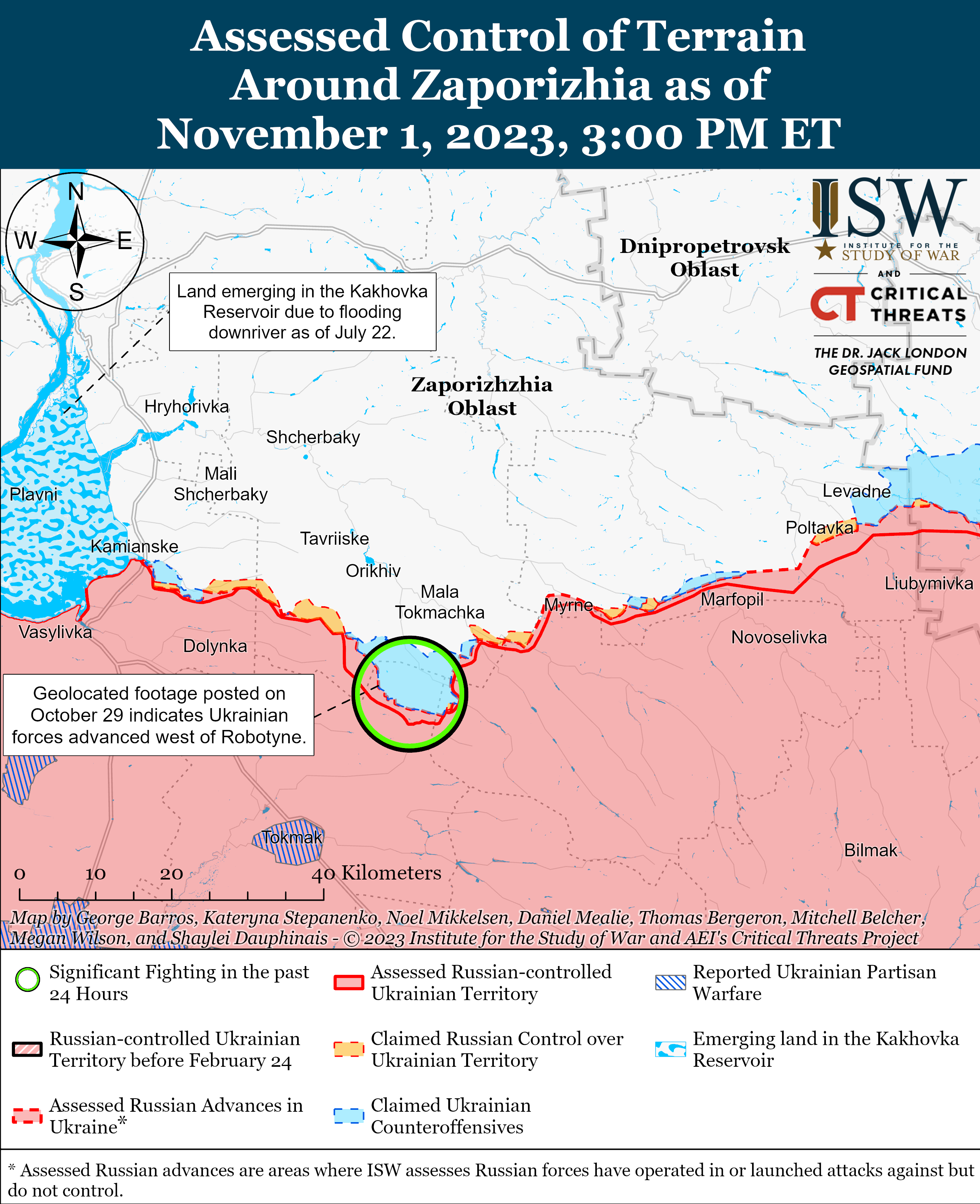 Ukrainian forces continued offensive operations in western Zaporizhia Oblast on November 1 and reportedly advanced. A Russian milblogger claimed that Ukrainian forces marginally advanced from Shcherbaky (18km west of Orikhiv) towards Myrne (16km southwest of Orikhiv) and made gains west of Robotyne (10km south of Orikhiv).[68] Russian milbloggers claimed that Ukrainian forces unsuccessfully attacked near Novoprokopivka (2km south of Robotyne) and Verbove (18km southeast of Orikhiv).[69]