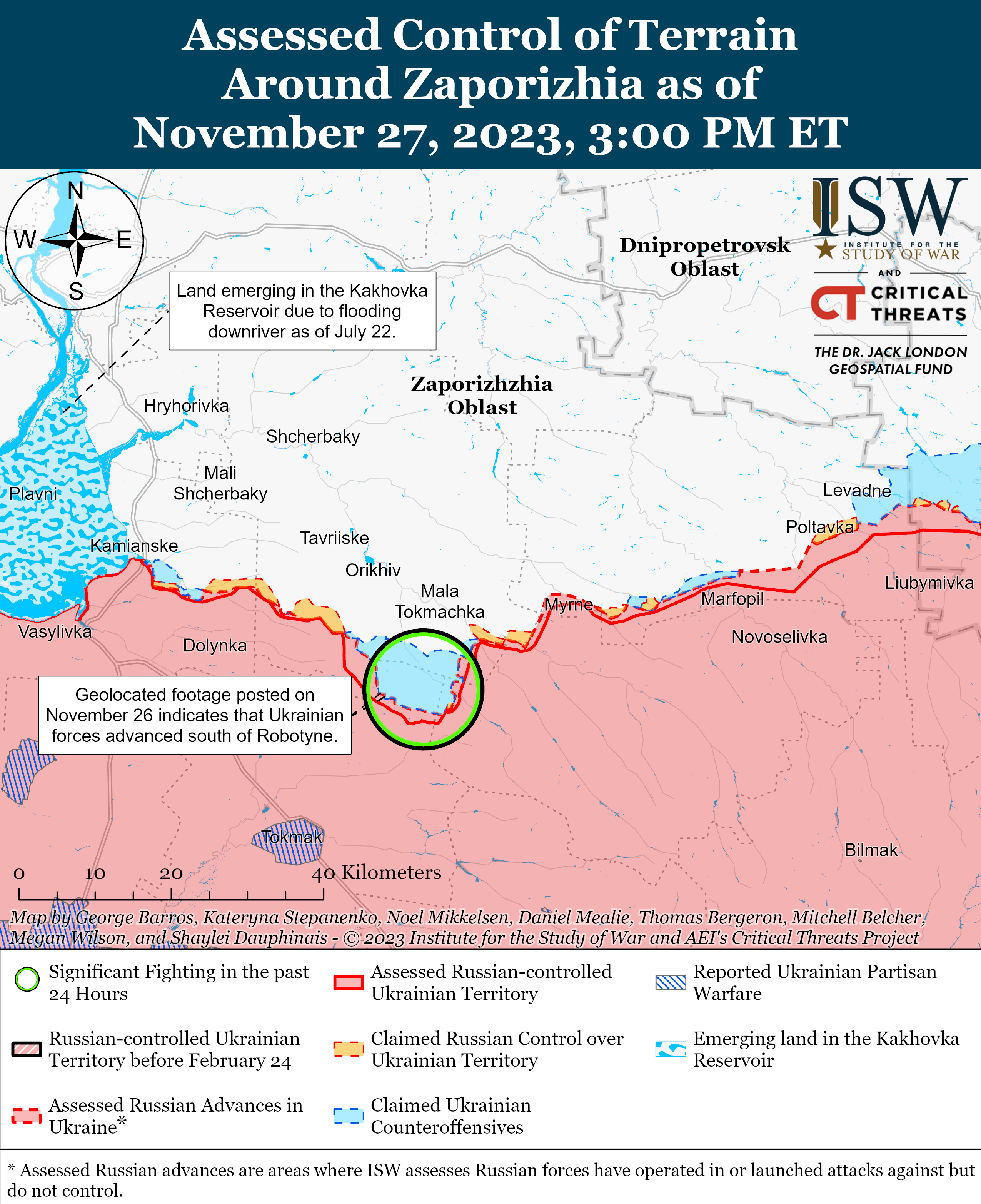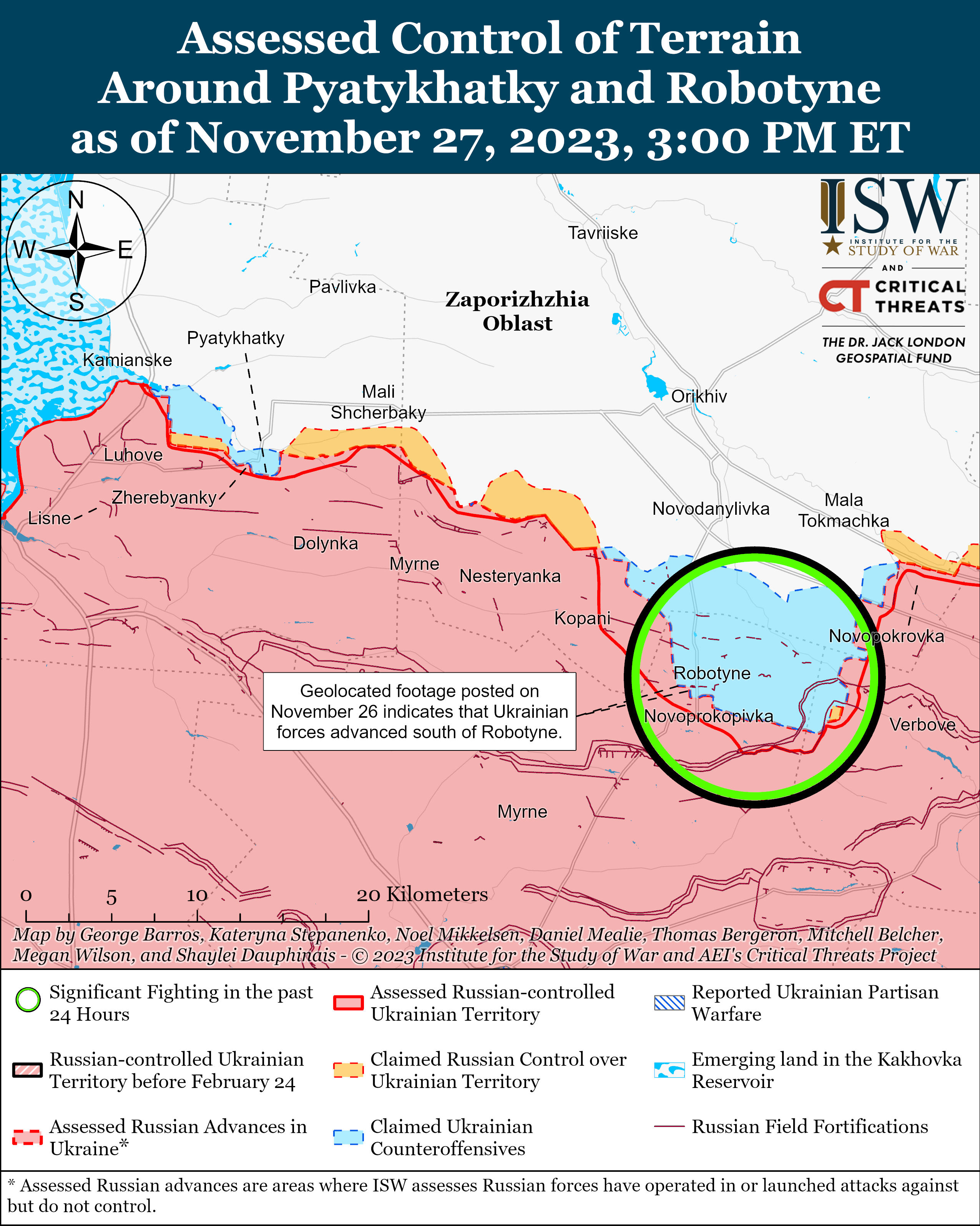 Ukrainian forces continued offensive operations in western Zaporizhia Oblast on November 27 and recently marginally advanced. Geolocated footage published on November 26 shows that Ukrainian forces made marginal advances south of Robotyne.[63] Russian sources claimed on November 27 that Russian forces repelled Ukrainian ground attacks near Robotyne, Novoprokopivka (2km south of Robotyne), and Verbove (10km east of Robotyne).[64]