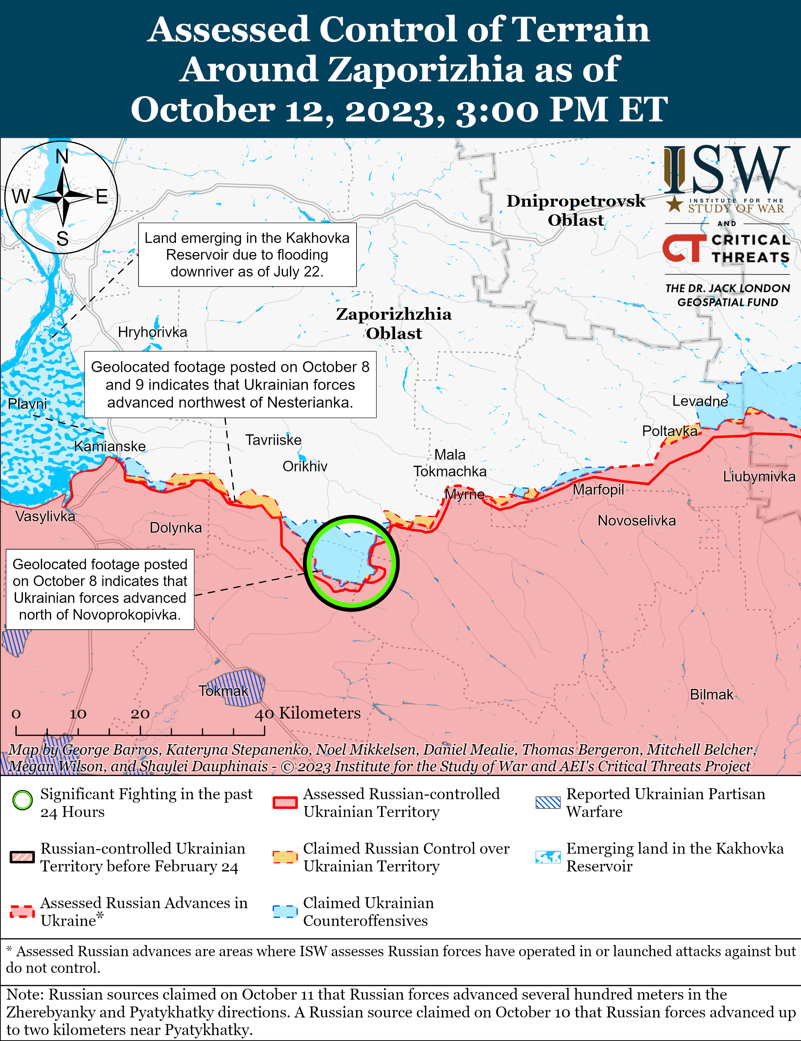 Ukrainian forces reportedly marginally advanced in western Zaporizhia Oblast on October 12. The Ukrainian General Staff and Shtupun reported that Ukrainian forces improved their tactical positions west of Robotyne.[72] A Russian milblogger claimed that Ukrainian forces attacked near Novoprokopivka (13km south of Orikhiv) and Novokarlivka (18km southeast of Orikhiv).[73] Russian milbloggers claimed that Russian forces repelled Ukrainian attacks on the Robotyne-Kopani line (5km northwest of Robotyne) and near Verbove (18km southeast of Orikhiv).[74] Russian milbloggers claimed that Ukrainian forces reduced their tempo of offensive operations in western Zaporizhia Oblast.[75]