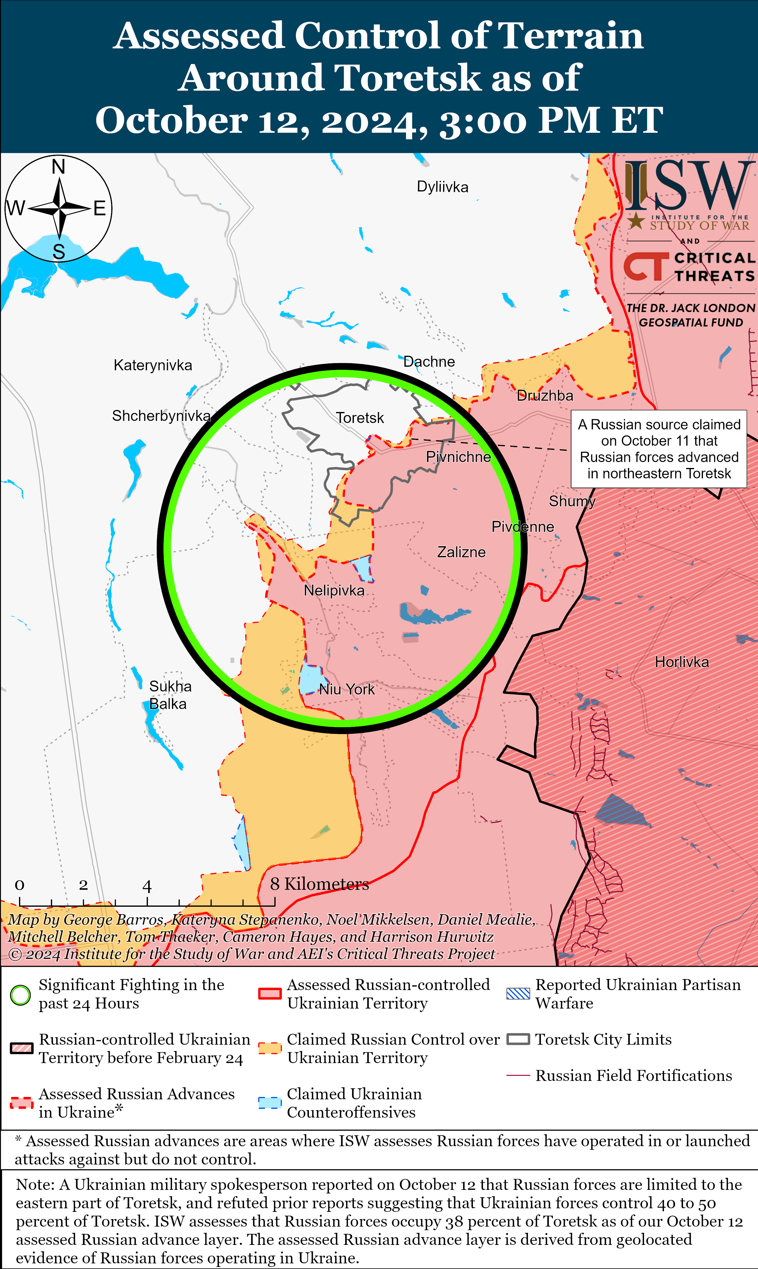 Russian forces continued offensive operations near Toretsk on October 12 but did not make any confirmed gains. Russian milbloggers claimed that Russian forces advanced 1.3 kilometers deep northwest of Niu York (south of Toretsk) and closer towards the Tsentralna mine within southern and central Toretsk.[59] ISW has not observed visual confirmation of these Russian claims, however. Russian forces continued offensive operations near Toretsk; north of Toretsk near Dachne and Dyliivka; and south of Toretsk near Nelipivka and in the direction of Shcherbynivka and Petrivka on October 11 and 12.[60]