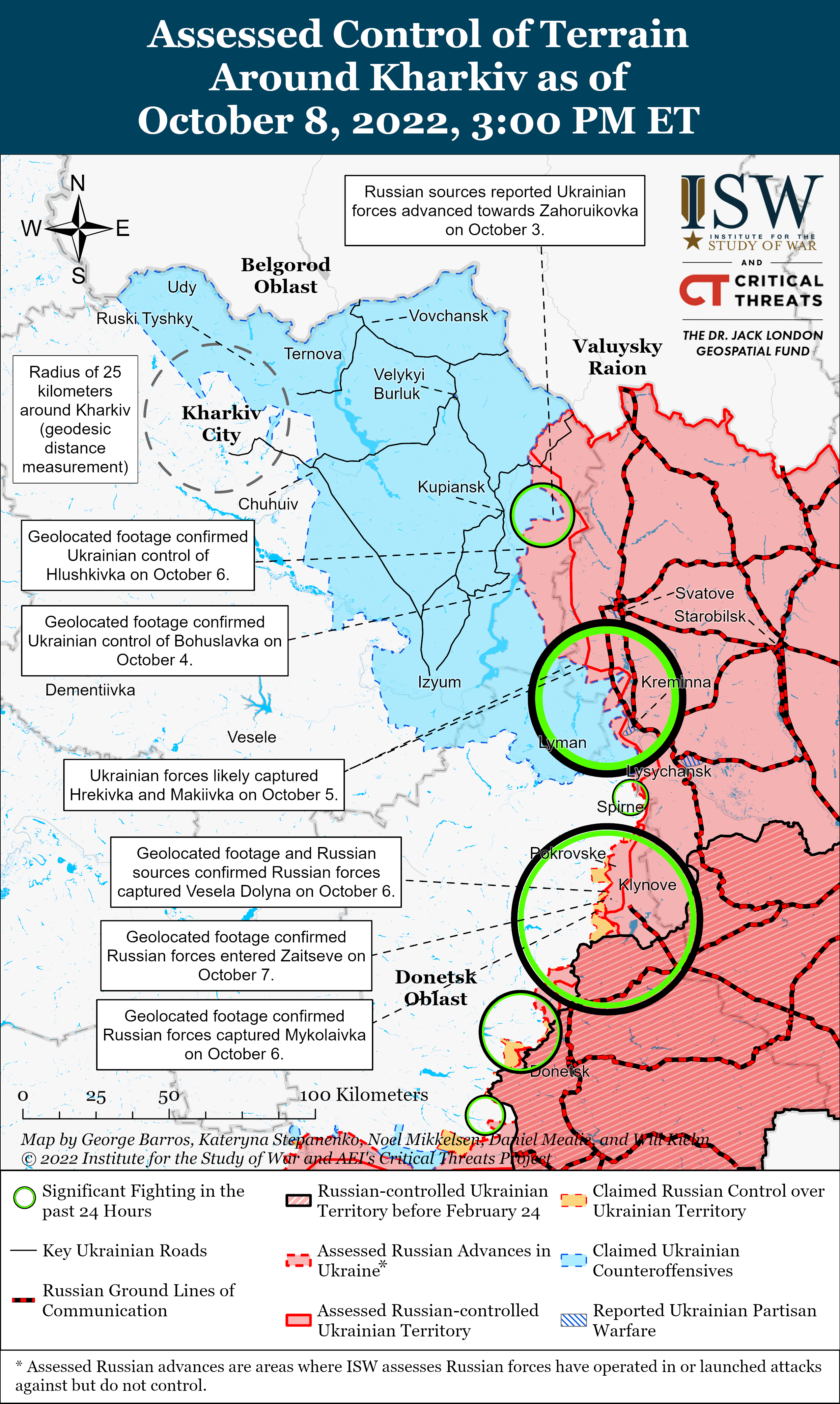 Russian sources claimed that Ukrainian forces continued counteroffensive operations from Kharkiv Oblast in the direction of Svatove on October 8. The Russian Ministry of Defense (MoD) claimed that Russian forces repelled Ukrainian assaults southeast of Kupyansk.[21] The Head of the Kharkiv Oblast administration, Oleg Synehubov, reported that Russian forces continued to shell Kupyansk and surrounding settlements.[22] Russian forces continued routine artillery, air, and missile strikes in eastern Ukraine in the vicinity of Kharkiv City, Bohodukhiv, and near Izyum.[23]
