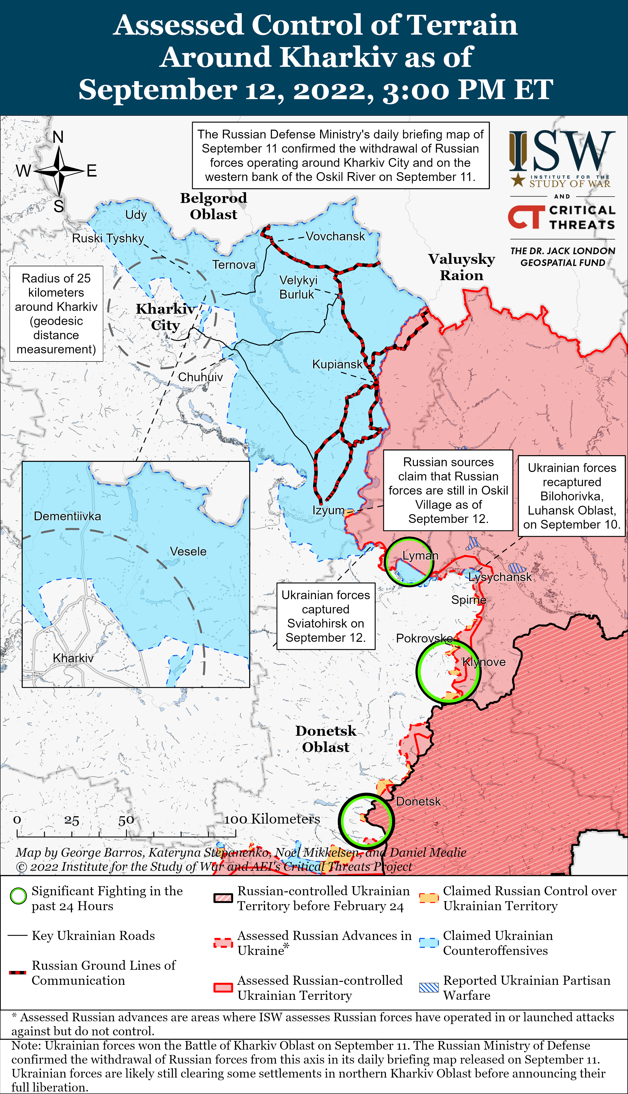The Ukrainian recapture of Izyum has likely degraded Russian forces’ ability to conduct artillery strikes along the Izyum-Slovyansk highway. The Ukrainian General Staff noted that Russian forces did not conduct artillery strikes in the Slovyansk direction on September 12, likely referring to settlements northwest of Slovyansk on the E40 highway.[22] Russian forces continued routine fire on Slovyansk and the surrounding area to the east, southeast, and south.[23]