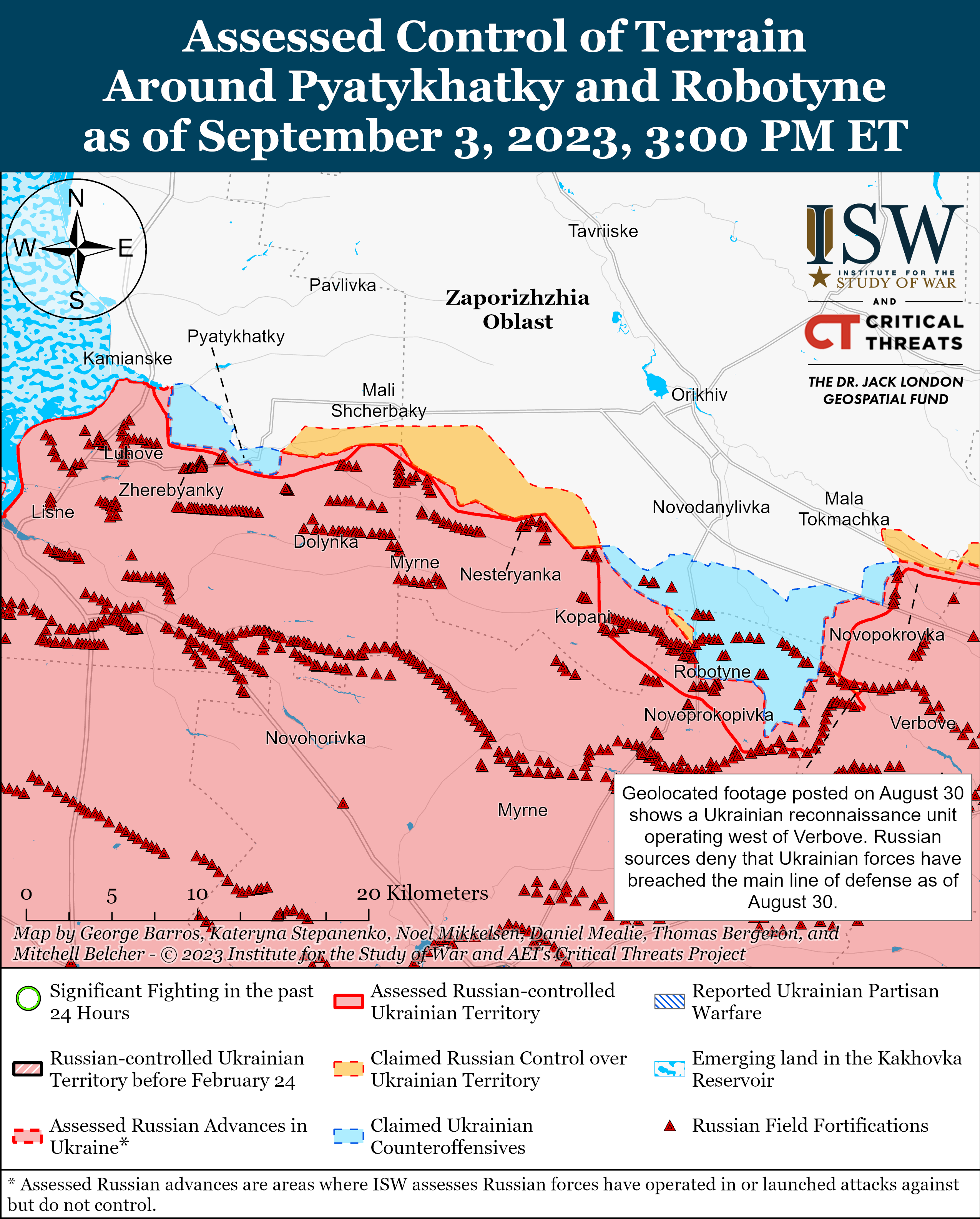 Ukrainian forces conducted offensive operations in western Zaporizhia on September 3 and reportedly advanced. Ukrainian Tavriisk Group of Forces Spokesperson Oleksandr Shtupun stated that Ukrainian forces achieved unspecified successes in the direction of Verbove (18km southeast of Orikhiv).[66] A Russian milblogger claimed on September 2 that Ukrainian forces are expanding their foothold between Novoprokopivka (13km south of Orikhiv) and Verbove.[67] The milblogger claimed that Ukrainian forces control northern and central Robotyne (10km south of Orikhiv) while the southern part of the settlement is contested.[68] Some Russian milbloggers claimed that Russian forces retain control of the southern outskirts of Robotyne, while others claimed that Russian forces retreated to the south.[69] Russian sources, including the Russian Ministry of Defense (MoD), claimed that Ukrainian forces unsuccessfully attacked near Robotyne and Verbove.[70] A Russian source claimed on September 2 and 3 that Ukrainian forces continue assaults near Verbove from the northwest.[71] Another Russian milblogger claimed that Ukrainian forces are attacking east of Novoprokopivka in the direction of Pshenychne (17km southeast of Orikhiv).[72]