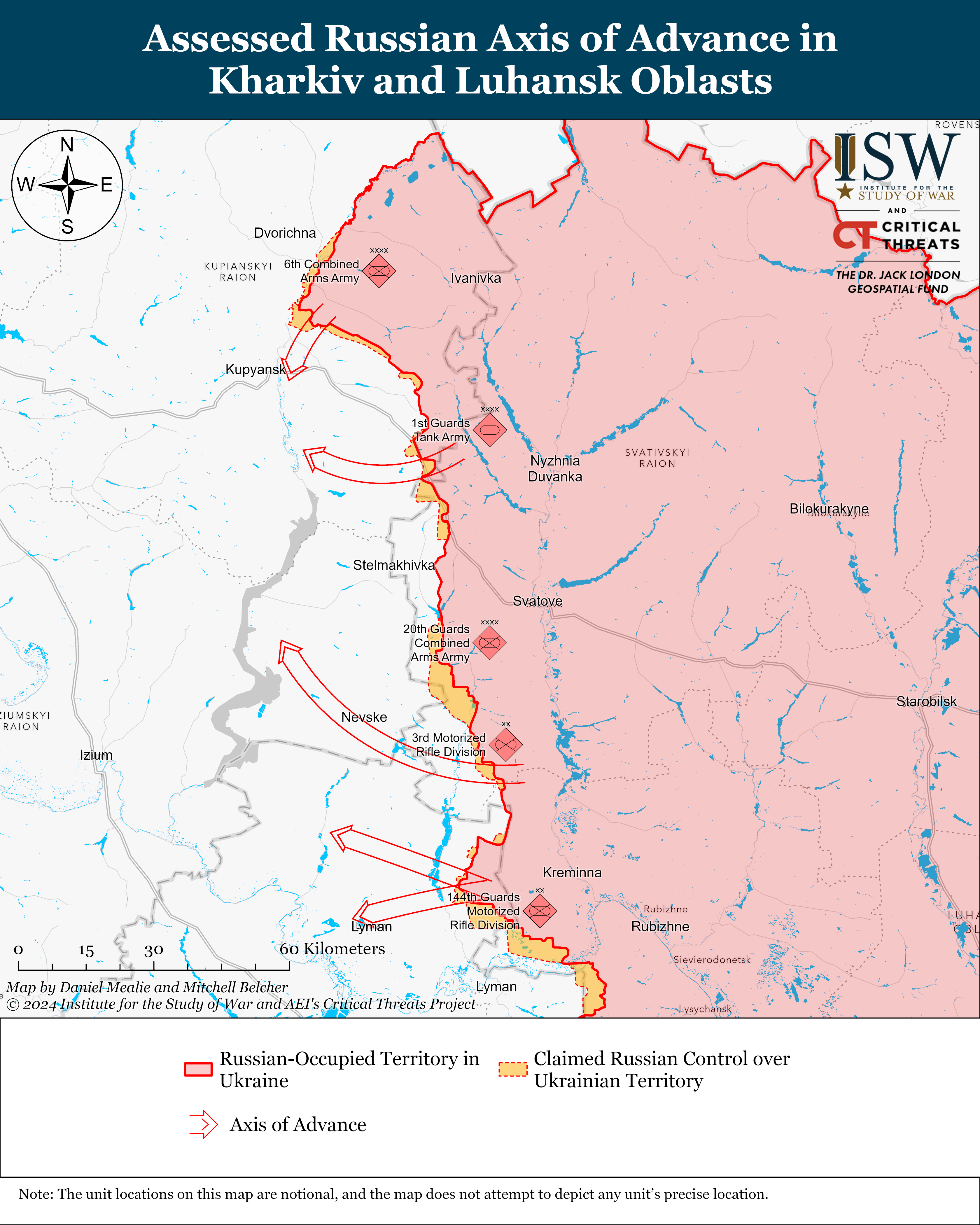 The apparent coordination of Russian offensive efforts along the four axes on the Kupyansk-Svatove-Kreminna line is likely reflective of a wider operational objective and higher-level operational planning. Russian objectives in each direction of advance appear to add up to a wider cohesive operational objective to seize the east bank of the Oskil River in Kharkiv Oblast. Russian operations on each axis share similarities in design and support one another in ways that suggest that the command of the Russian Western Grouping of Forces has planned a larger operation in pursuit of this cohesive operational objective.