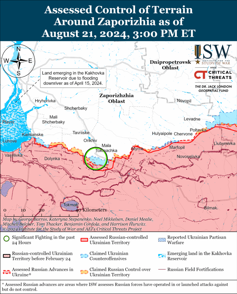 Assessed Control of Terrain Around Zaporizhia as of August 21, 2024, 3:00 PM ET