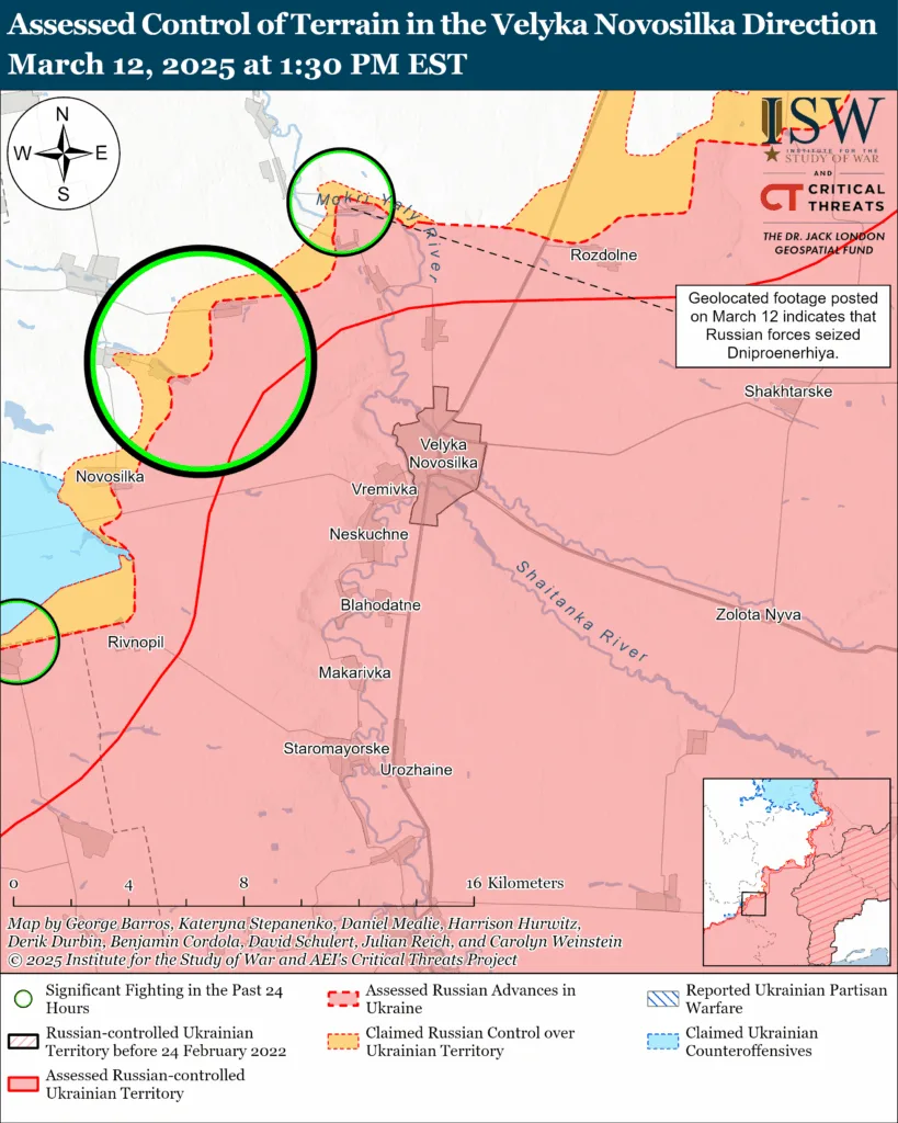 Assessed Control of Terrain in the Velyka Novosilka Direction, March 12, 2025 at 1:30 PM ET