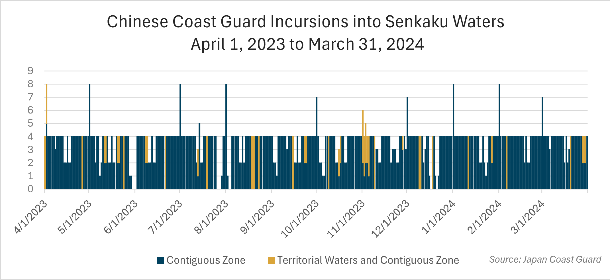 The CCG began near-daily incursions into the Senkaku Islands’ adjacent waters in 2012 and significantly increased the volume of these incursions in 2019. It has made 90-110 incursions in most months since April 2019 into the Senkaku Islands’ contiguous zone, as well as 4-12 incursions into the territorial waters within 12 nautical miles of the islands. CCG ships entered 121 times into the archipelago’s contiguous zone and 10 times into its territorial waters in March 2024.[43] There were only 10 days since April 1, 2023, without CCG incursions into the contiguous waters.