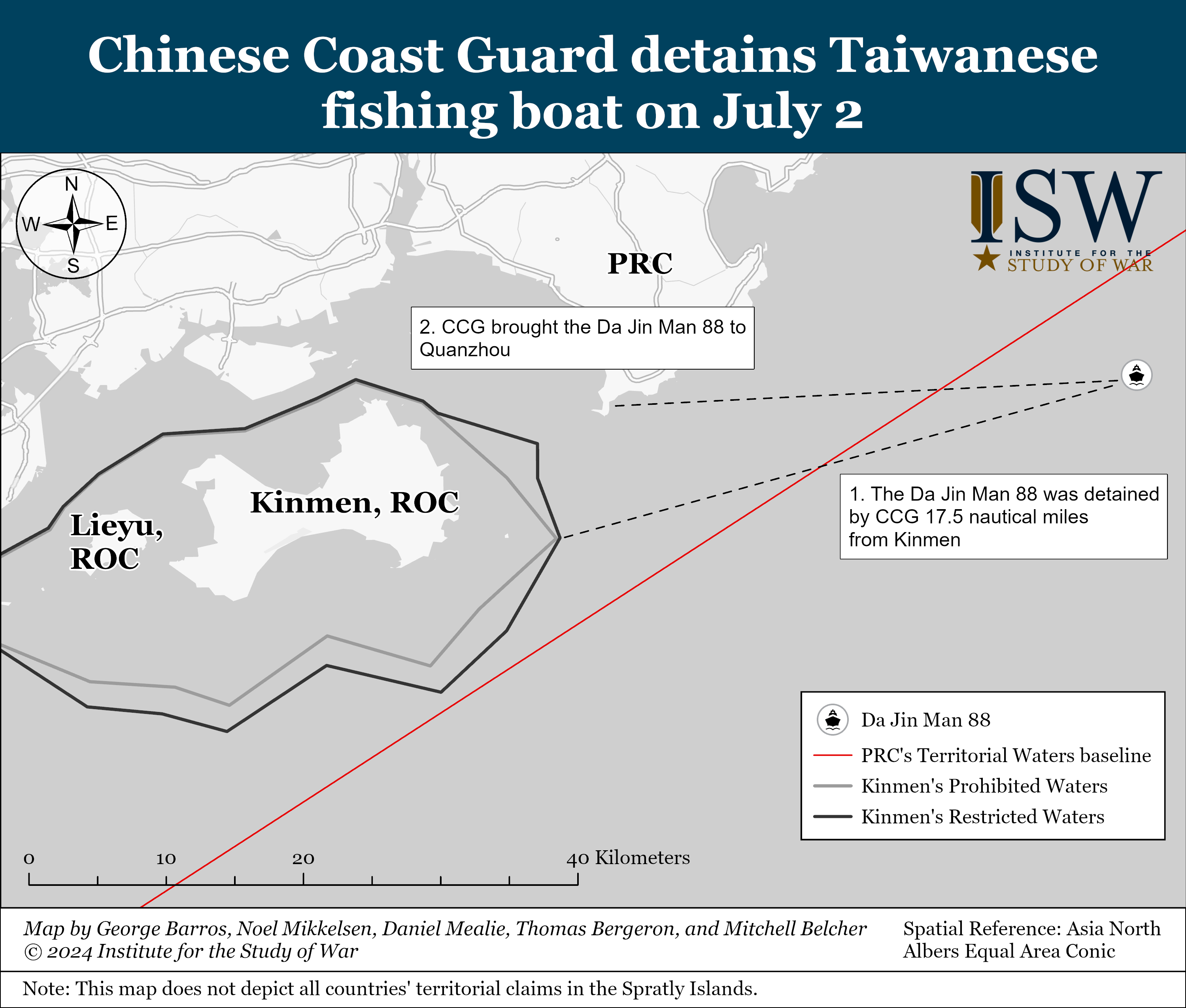 The PRC released four members of a Taiwanese fishing boat on August 13, whom it detained near Kinmen on July 2.[1] The crew’s release does not indicate a change in the PRC’s long-term coercion campaign against Taiwan, however. The PRC continues to hold the Taiwanese captain of the crew and the boat, with no confirmed date for their release. The Chinese Coast Guard (CCG) detained the crew and boat for fishing in PRC waters during a seasonal fishing moratorium. The crew’s release comes after the PRC and ROC made progress in resolving the handling of the February 14 capsizing incident, in which two PRC fishermen died while fleeing from a Taiwanese Coast Guard pursuit near Kinmen. Kinmen is a group of Taiwan-controlled islands with a large military garrison roughly 3 kilometers from the coast of the PRC. The July 30 deal concludes lengthy backchannel negotiations that stalled in early March, resulting in the ROC returning the bodies of the deceased and paying restitution to their families. The PRC released a Taiwanese former soldier that it held for nearly five months on August 7 after the deal.[2]