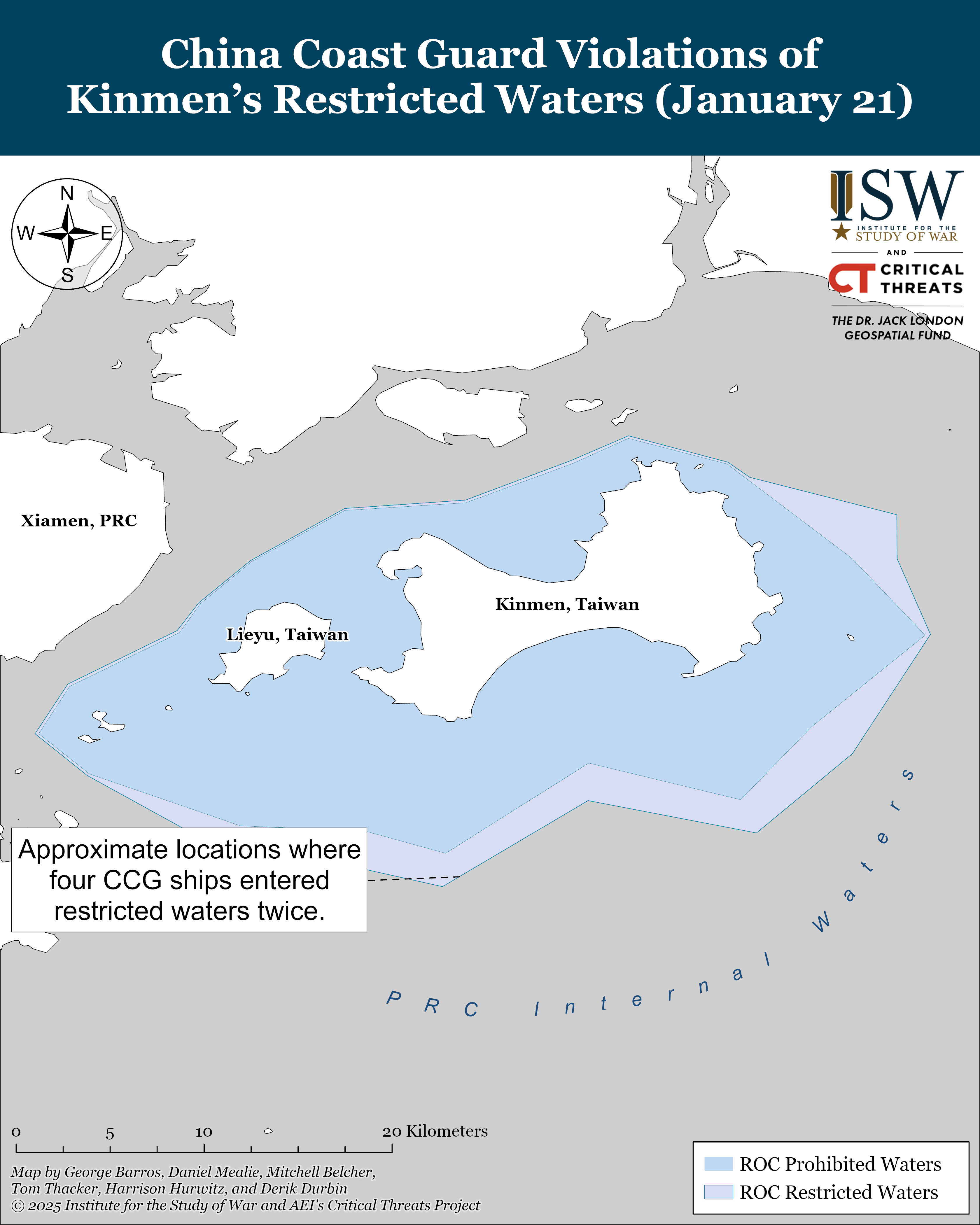 Four China Coast Guard (CCG) ships entered restricted waters around Taiwan’s Kinmen Islands twice on January 21. Four CCG ships entered at four different locations in Kinmen’s southern restricted waters at 7:50 a.m., then split into two two-ship formations for patrols. The ships left at an unspecified time, re-entered later in the morning, and finally left again at noon. Taiwan’s CGA said that it was the 56th such incursion since the beginning of 2024.[53] Kinmen is an ROC archipelago located just two miles from the PRC mainland. Taiwan does not claim territorial waters or a contiguous zone around the islands due to their proximity to the PRC but maintains concentric prohibited and restricted zones around the islands that are roughly equivalent. Controlling the restricted waters south of Kinmen could enable the CCG to carry out a tight “quarantine” or blockade of the islands if it chooses, blocking passage between the islands and Taiwan proper.