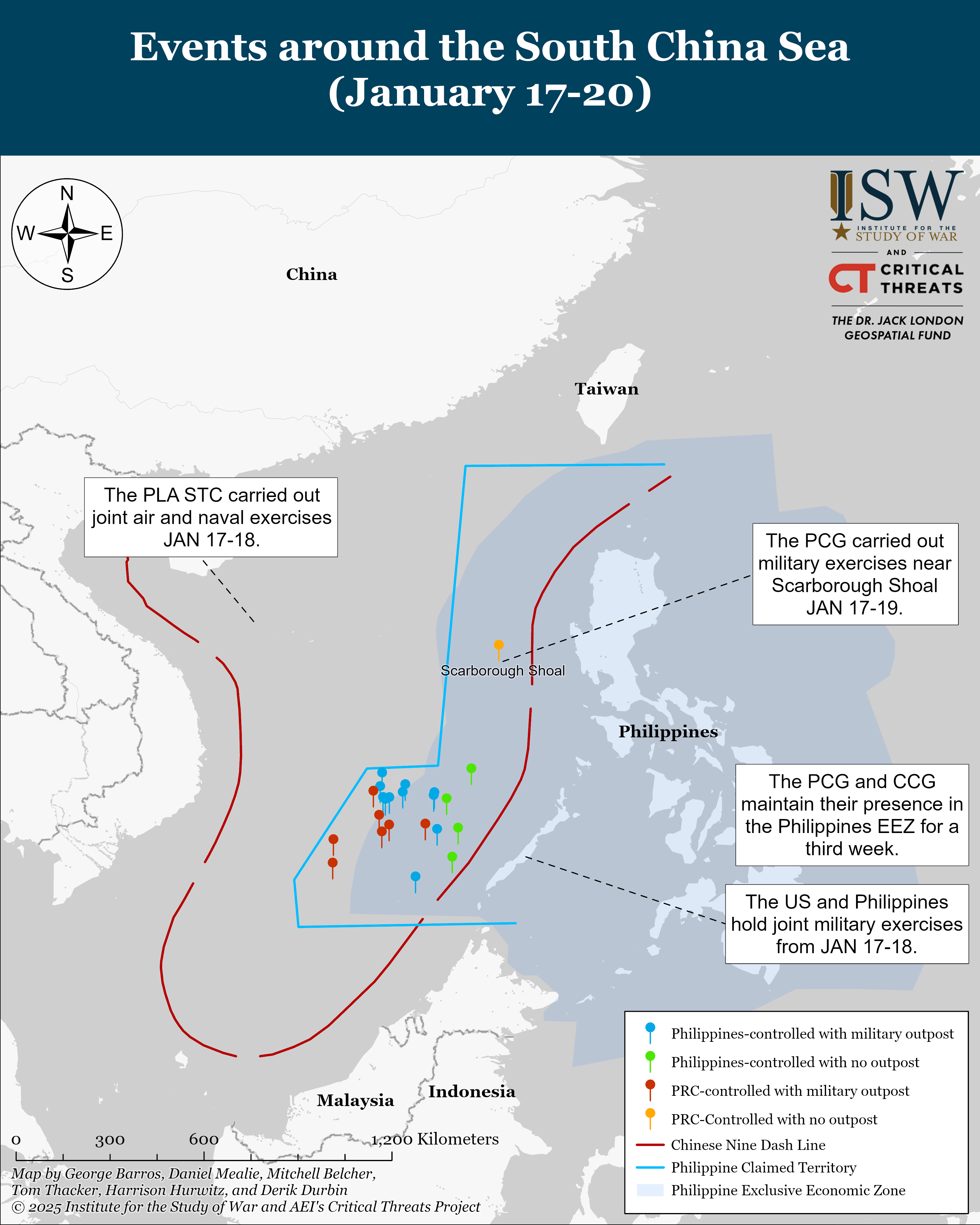 The PRC carried out military exercises in the South China Sea in response to joint US-Philippine exercises and Philippine Naval patrols around Scarborough Shoal. The Philippines Coast Guard (PCG) marked its third week of actively challenging China Coast Guard (CCG) presence in the Philippines EEZ. The Philippine Navy conducted a patrol and live-fire drills near Scarborough Shoal from January 17-19.[102] The US Navy’s Carl Vincent carrier strike group joined two Philippine naval vessels for a Maritime Cooperative Activity (MCA) near the Philippines’ western Palawan province from January 17-18.[103] This marked the fifth bilateral naval patrol between the United States and the Philippines to occur in the South China Sea since 2023 and is the first joint effort between the two states to occur in 2025. The PLA Southern Theater Command (STC) responded to these exercises by carrying out its own two-day air and naval exercises in the South China Sea.[104] The STC stated that the exercise was for the purpose of maintaining peace and security within what the PRC views as its maritime territory. Tensions in the South China Sea have been high since the beginning of 2025, centered around a three-week standoff between the PCG and CCG off the western coast of Luzon.[105]