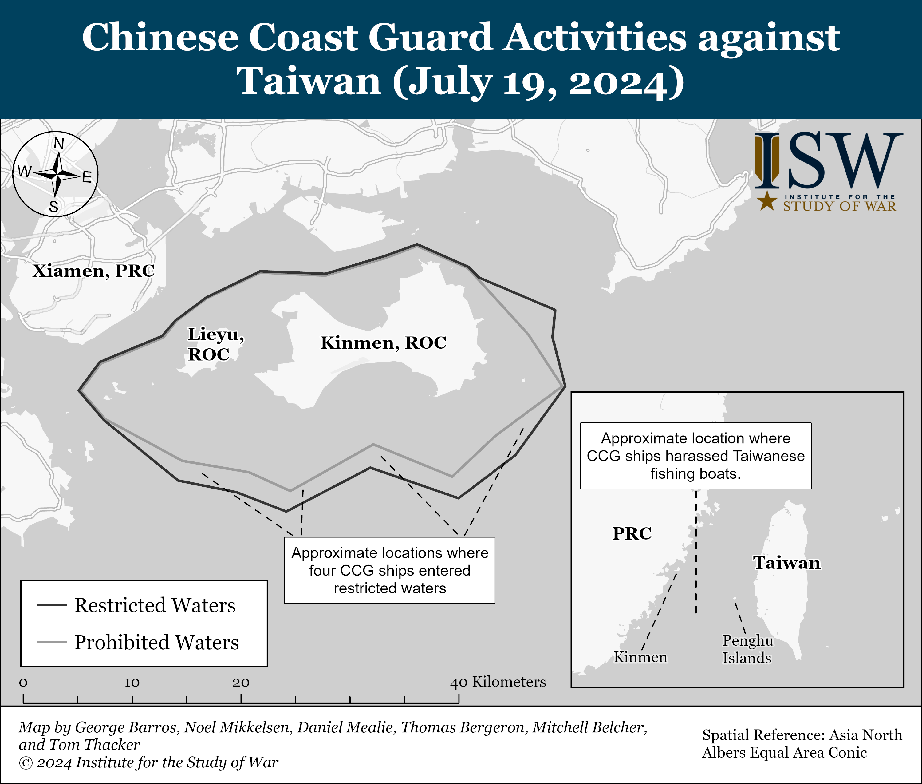 The PRC began regular CCG patrols around Kinmen and incursions into Kinmen’s restricted and prohibited since February 2024 to assert its sovereignty over those waters and to punish Taiwan for electing President Lai Ching-te, whom the PRC considers a dangerous separatist. It substantially increased the frequency of incursions in May, around the time of Lai’s inauguration, and shifted from fixed-line patrols into Kinmen waters to designating “patrol areas” within which individual CCG ships can patrol in a less predictable pattern. Taiwanese media has also reported occasional instances of CCG ships harassing Taiwanese fishermen near the Penghu Islands, including one incident on July 5 that occurred 3.5 miles east of the Taiwan Strait median line.[4] The expansion of CCG “law enforcement” activities into Taiwan-controlled waters around Kinmen and eastward into international waters near Taiwan shows an intensifying PRC campaign to assert control over the waters near and around Taiwan.