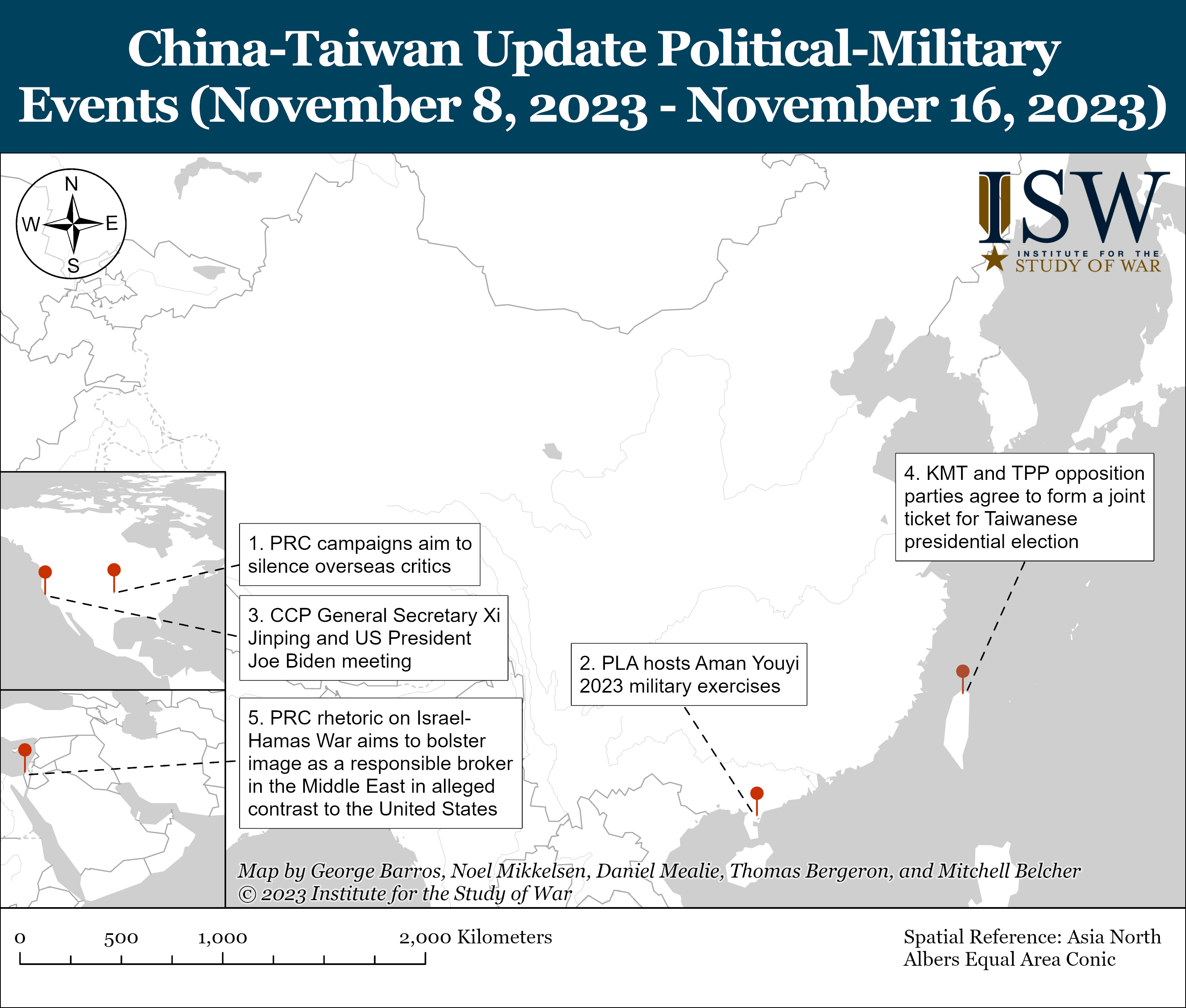 The Taiwan People’s Party (TPP) and Kuomintang (KMT) overcame the biggest hurdle to forming a joint presidential ticket on November 15 and plan to announce the ticket order on November 18. TPP candidate Ko Wen-je and KMT candidate Hou Yu-ih agreed on a method to determine the ticket order for the joint ticket. The issue was a key sticking point that stalled progress on cooperation since the two parties entered formal negotiations on October 14.[25] The two parties agreed to use opinion polls from November 7-17 to determine the selection of a joint candidate but did not specify which polls they will consider.[26] The parties will appoint their own polling statisticians to contribute additional internal polls and determine which public polls qualify.[27] This outcome is consistent with ISW’s earlier assessments that the two parties would unite under a joint ticket before the candidate registration deadline on November 24.[28]