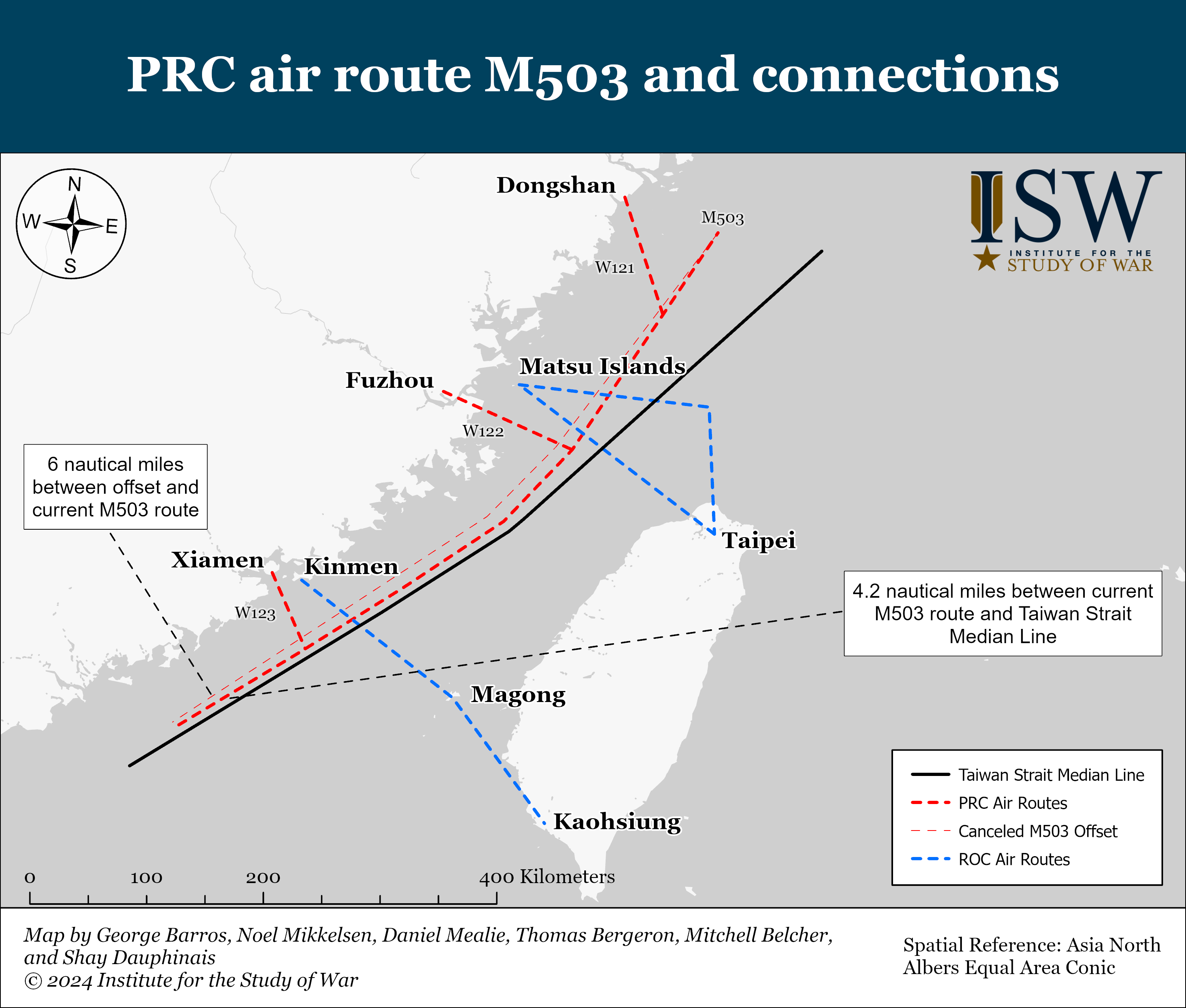Taiwan’s Civil Aviation Administration (CAA) said the unilateral adjustment of the M503 route and the addition of the new connecting routes posed a danger to air traffic in the area.[40] The PRC’s TAO denied that there were any security concerns about the new flight routes and also denied the existence of a median line in the Taiwan Strait.[41]