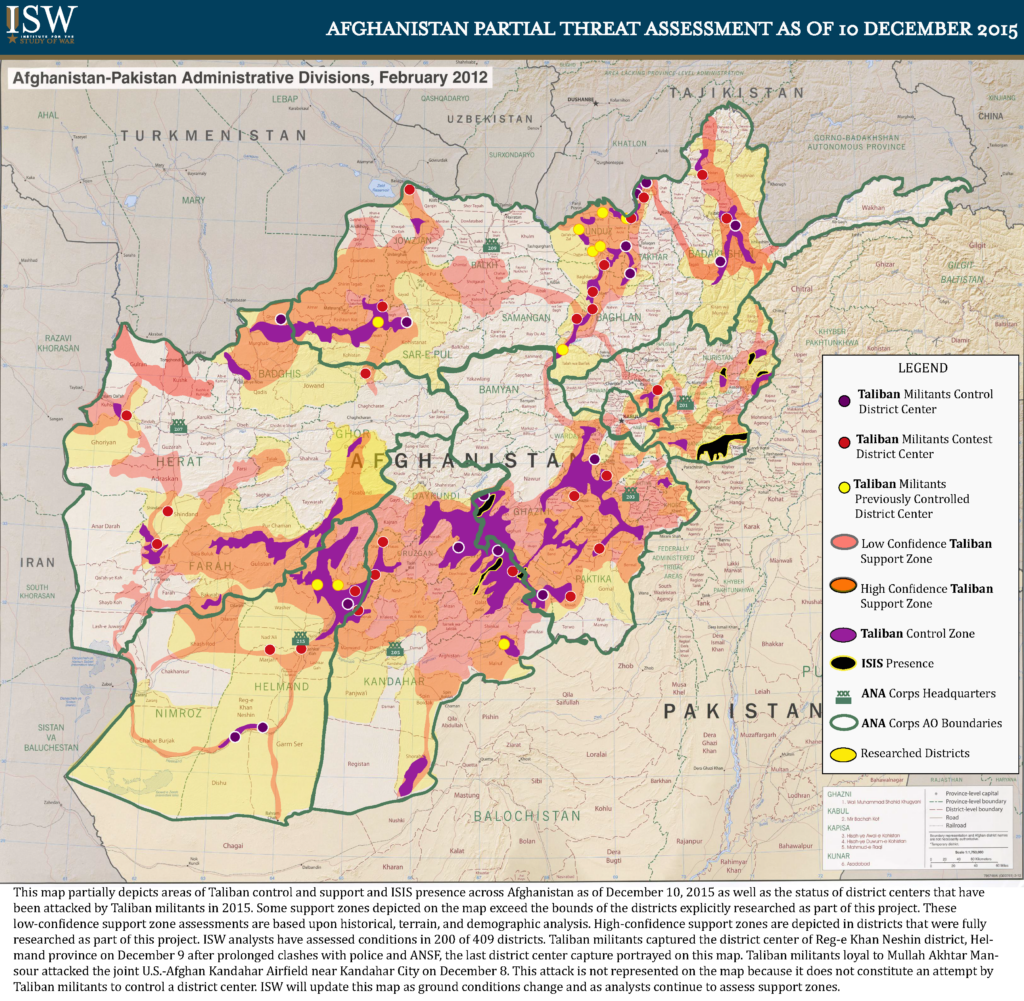 Key Takeaway: Militant forces including Taliban factions and the Islamic State’s Afghanistan-Pakistan affiliate, Wilayat Khorasan, control considerable terrain across Afghanistan as of December 2015. Militant control extends beyond historic militant sanctuaries and into numerous district centers, representing partial success at establishing governance. Taliban forces are making unprecedented gains in areas that had been cleared and held during the surge, threatening provincial capitals in northern, southern, and eastern Afghanistan. Wilayat Khorasan has also begun to exert social control in Afghanistan, specifically in Nangarhar province, but this control has not yet extended to district centers. The ANSF lack the higher headquarters and mobility functions to conduct simultaneous or sequential campaigns to counter geographically dispersed threats. NATO lacks the force structure and authority to close this gap even with the enduring presence of 9,800 U.S. troops in 2016 1. Violent competition for power among militant groups has increased, particularly as the death of Taliban founder Mullah Omar became known, and is an increasing the threat to the Afghan government. The overall threat level in Afghanistan is sharply on the rise without sufficient mitigation