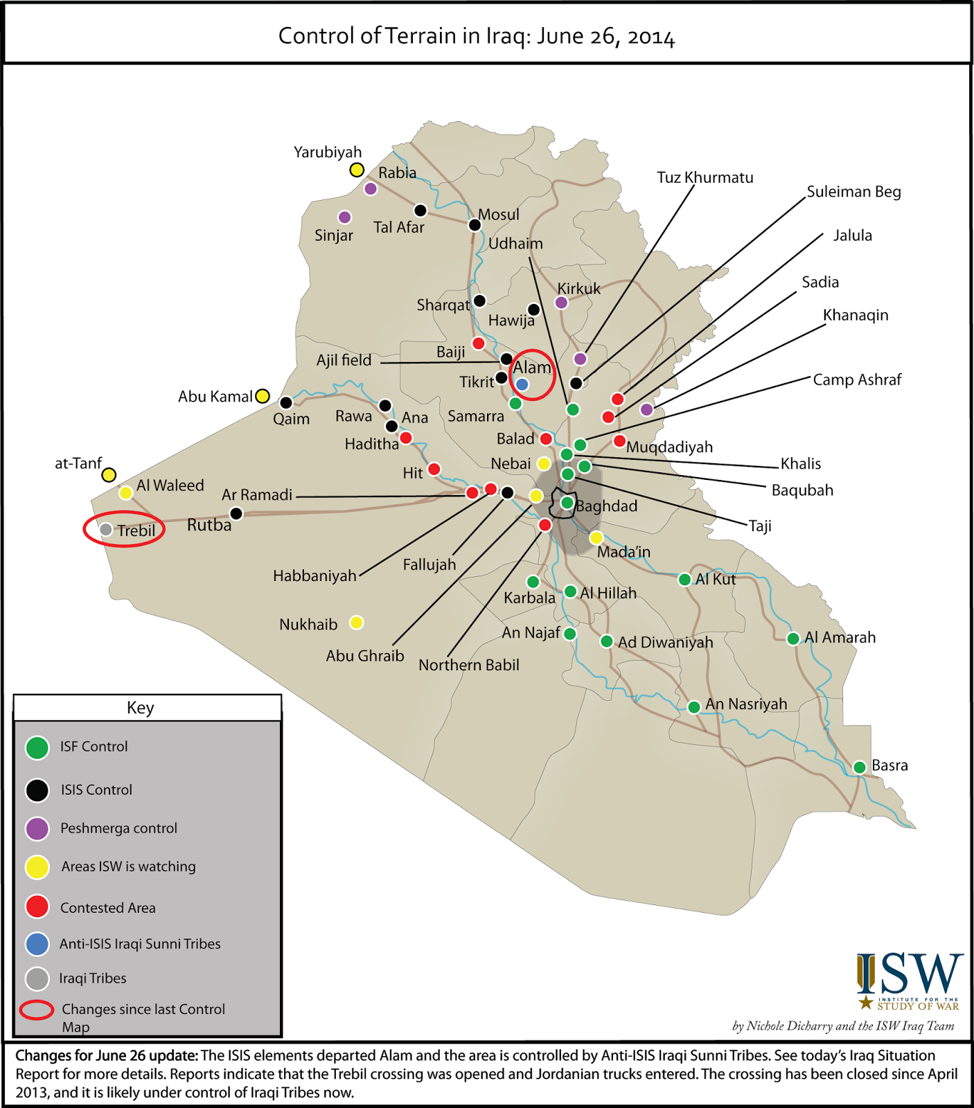 Previous Next Control of Terrain in Iraq: June 26, 2014 by Nichole Dicharry and Iraq Team Previous Next