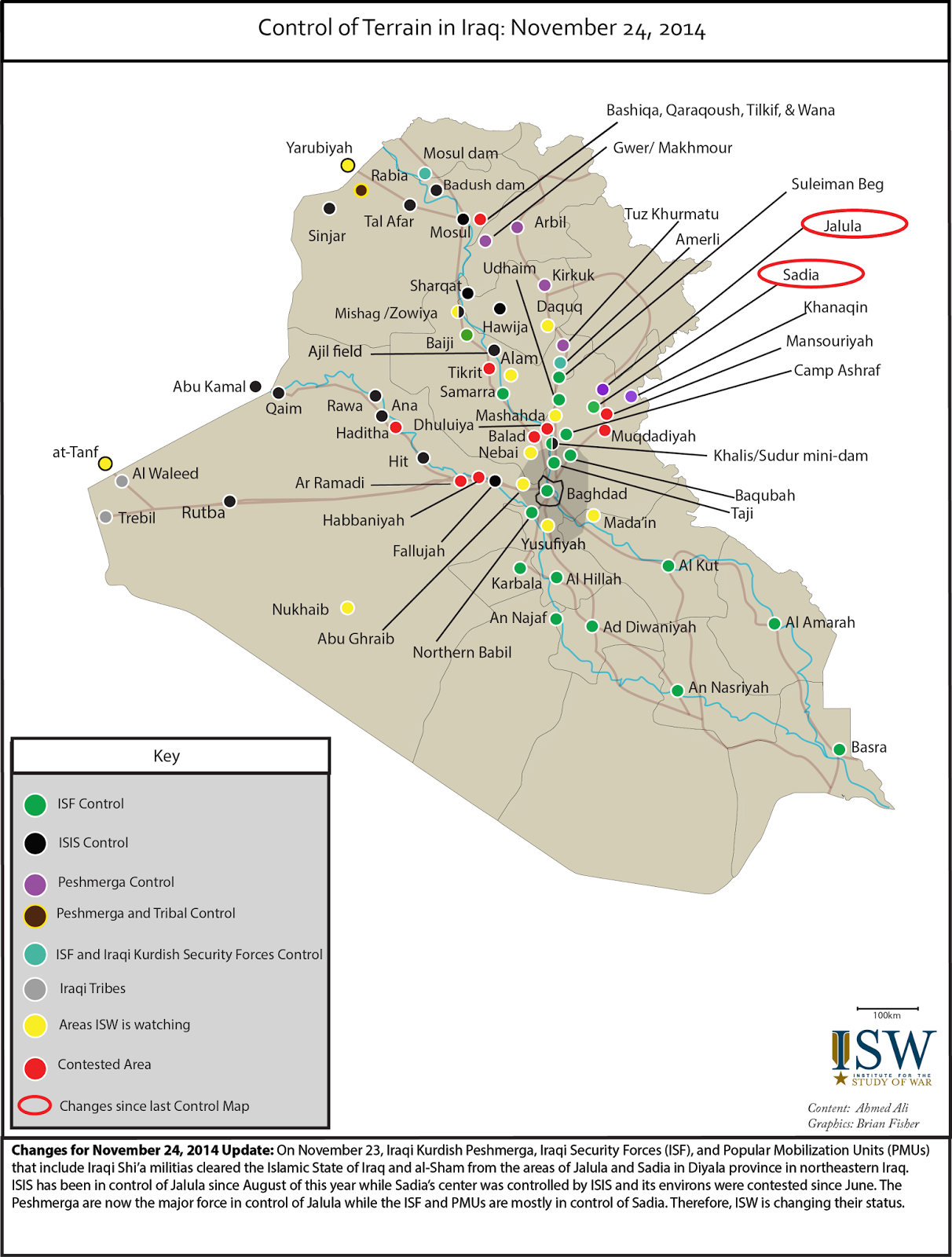 Previous Next Control of Terrain in Iraq: November 24, 2014 by Ahmed Ali & Brian Fisher Ahmed Ali is a Research Analyst and Iraq team leader at the Institute for the Study of War Previous Next