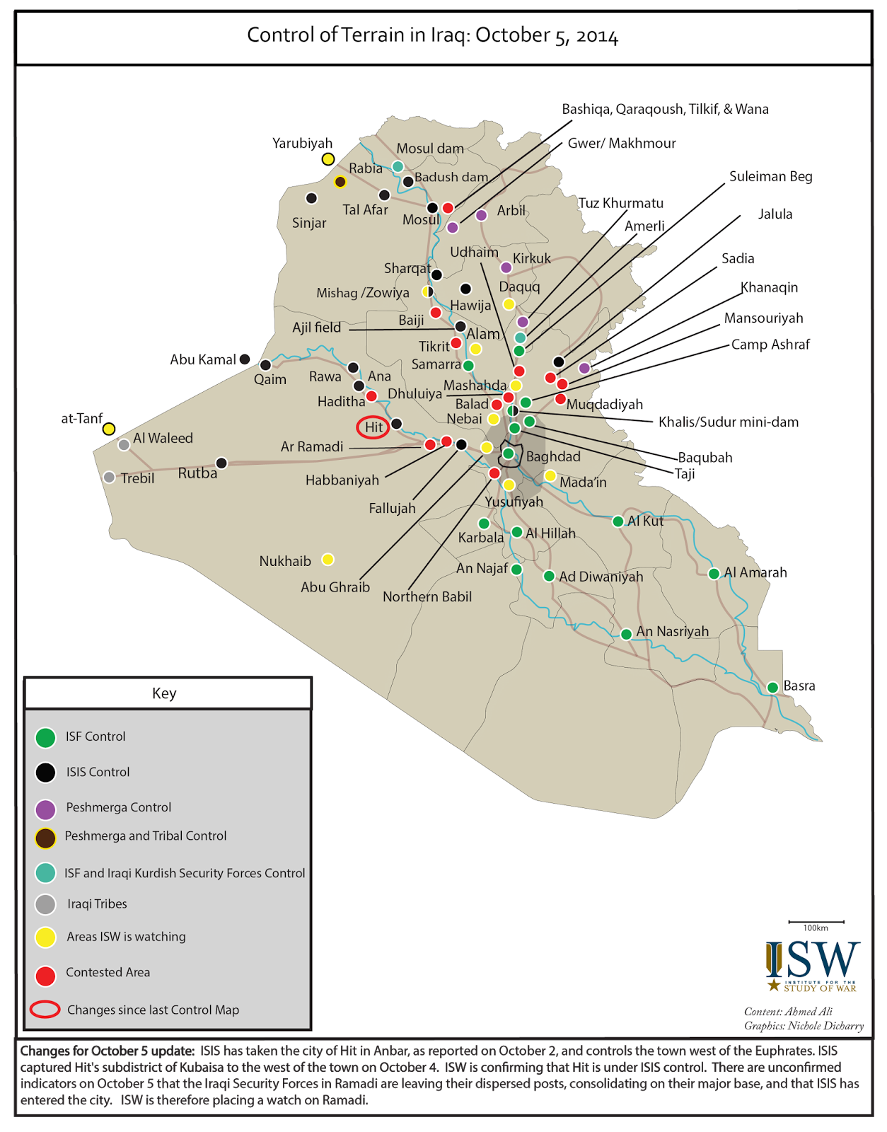 Previous Next Control of Terrain in Iraq: October 5, 2014 by Ahmed Ali and Nichole Dicharry Ahmed Ali is a Senior Iraq Research Analyst and the Iraq Team Lead. Previous Next
