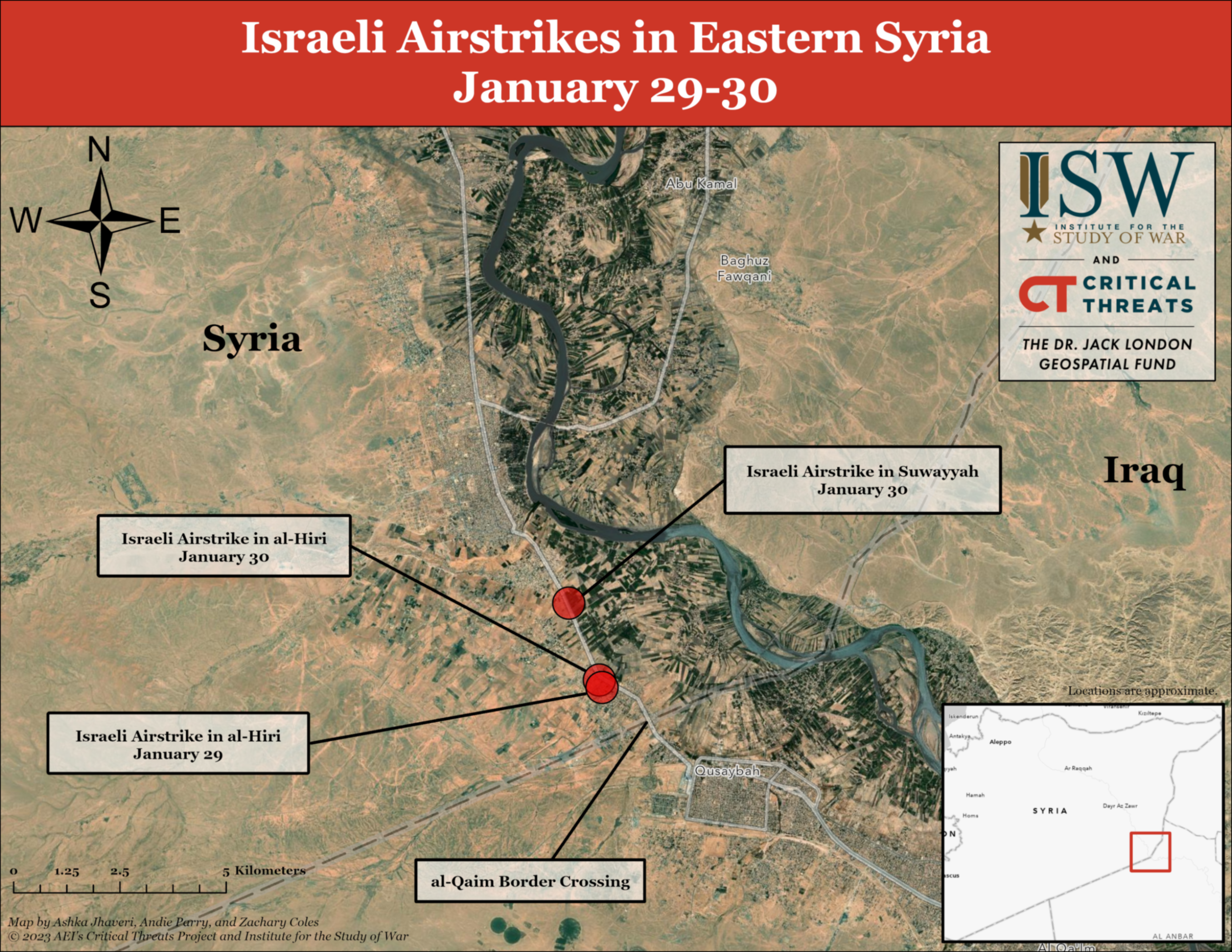 Israeli combat aircraft conducted three airstrikes against likely Iran-backed militants in eastern Syria on January 29 and January 30. Israeli combat aircraft targeted and destroyed six trucks traveling through al-Hiri, Deir ez-Zour Province shortly after the convoy crossed into Syria from the Iraqi al-Qaim border crossing on January 29.[1] Iranian proxy social media channels posted footage depicting a large fire in al-Hari immediately after the airstrike occurred, indicating that the attack may have detonated precision-guided munitions (PGMs) that Iran-backed militants attempted to conceal in what Iranian state media claimed to be a humanitarian convoy.[2] Iranian state-run Islamic Republic News Agency denied reports that the attack resulted in casualties among IRGC personnel.[3]