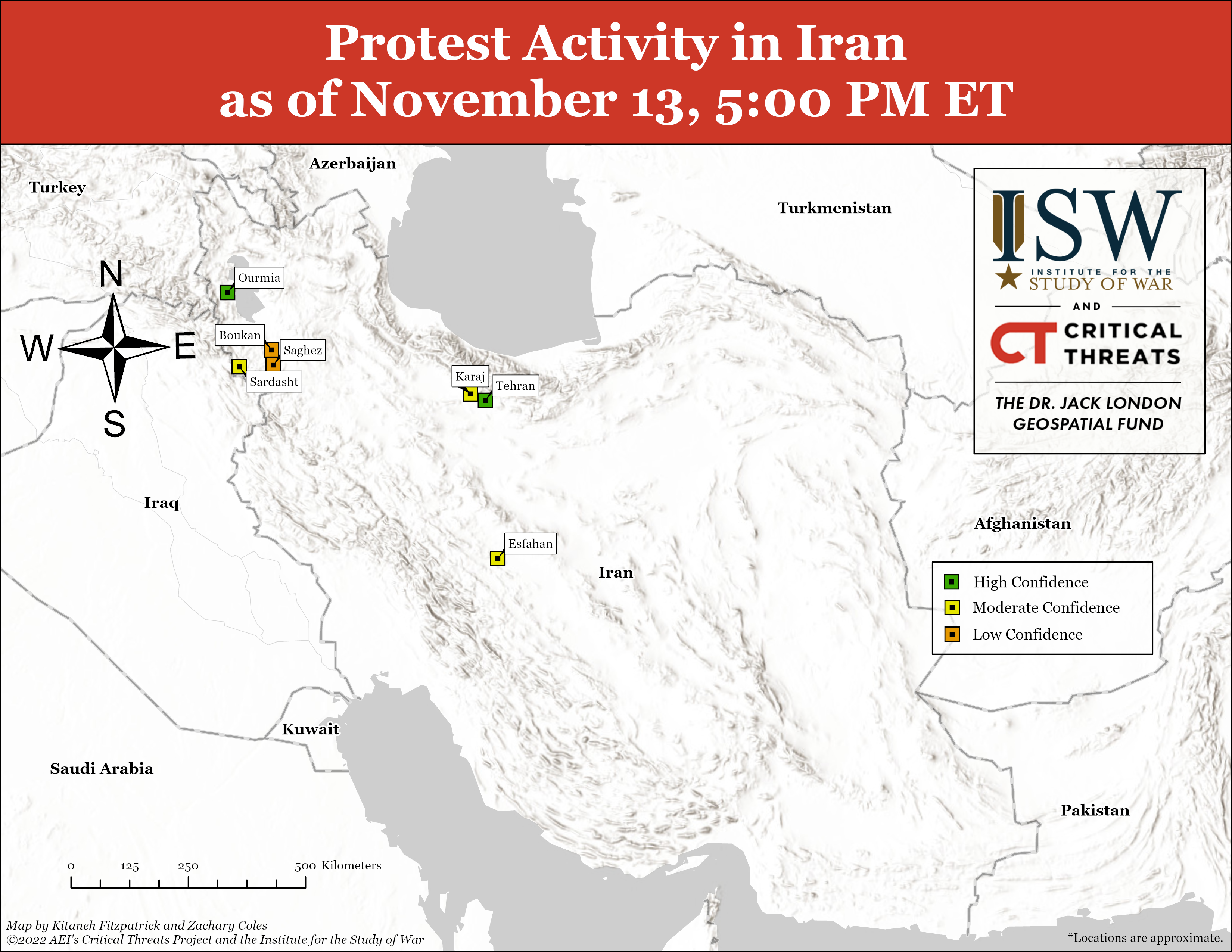 - At least 12 protests took place in seven cities across five provinces on November 13. CTP assesses with moderate to high confidence that protests occurred in the locations below.