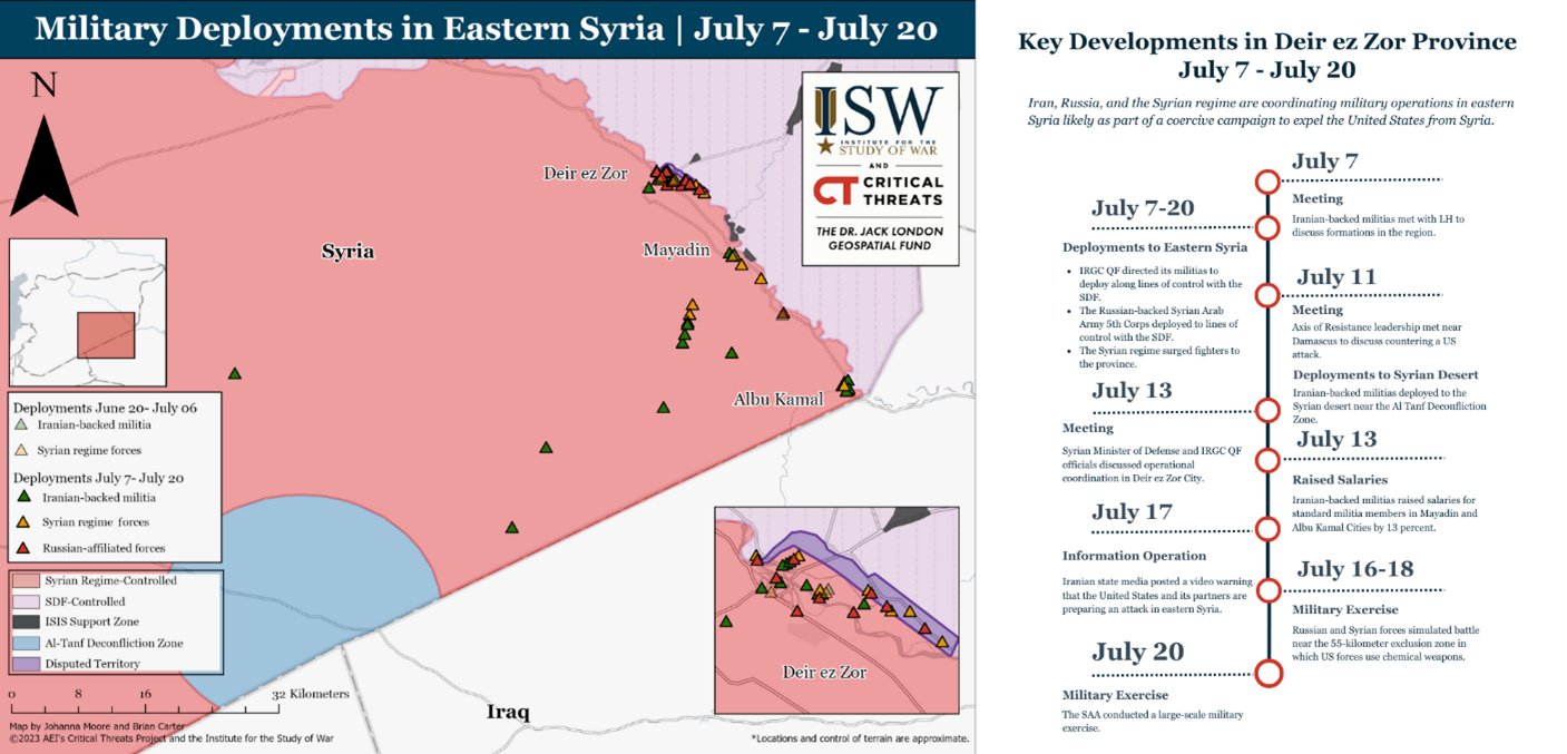 Iran, Russia, and the Syrian regime surged forces to eastern Syria beginning on July 7 while accelerating their campaign to expel US forces from Syria by spreading information operations, growing a grassroots movement, and meeting at the senior level for operational planning.
