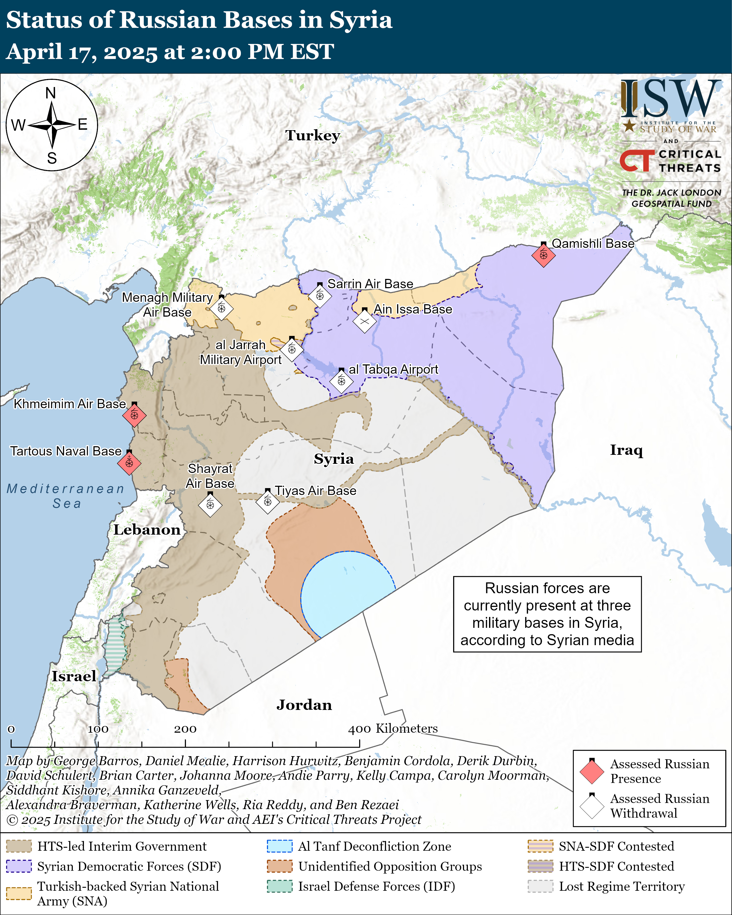 Russian President Vladimir Putin has continued to indicate that he seeks to develop stronger diplomatic and political relations with the Syrian transitional government. Russian President Vladimir Putin discussed Russian interests in Syria with Qatari Emir Tamim bin Hamad bin Khalifa al Thani in Moscow on April 17.[28] Putin emphasized that Russia supports Syrian sovereignty, independence, and territorial integrity and discussed providing aid to Syria with Thani.[29] Russia and the Syrian transitional government have engaged in months-long talks over the future of Russian bases in Syria. These talks have thus far not resulted in an agreement about Russian basing rights in Syria. Russia appears to have begun an incentives-based economic relationship with Syria and has delivered Syrian currency and Russian oil to Syria.[30] Russia also reportedly seeks to re-negotiate Russian investment contracts for phosphate mines and oil fields in the central Syrian desert.[31] CTP-ISW previously assessed that Russia might try to use these economic incentives to secure basing rights in Syria.[32] Thani said during a joint press conference with Putin that he and Syrian President Ahmed al Shara discussed Russo-Syrian relations during Shara’s visit to Qatar on April 15 and that Shara is “determined to continue this cooperation.”[33]