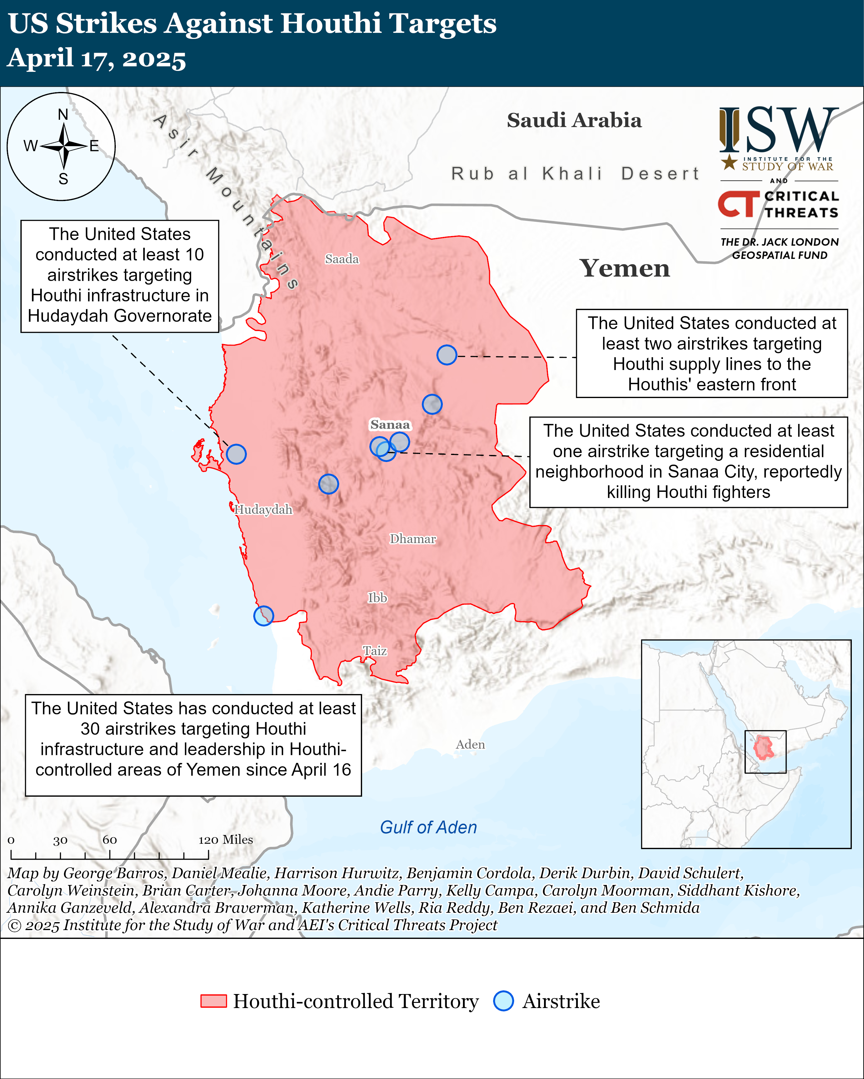 - China-Houthi Cooperation: A Chinese government-linked satellite company provided intelligence to the Houthis, according to US officials speaking to the Financial Times on April 17. This intelligence could support Houthi attacks against US vessels and commercial shipping, which demonstrates how the Houthis are continuing to cooperate with US adversaries to disrupt global trade.
