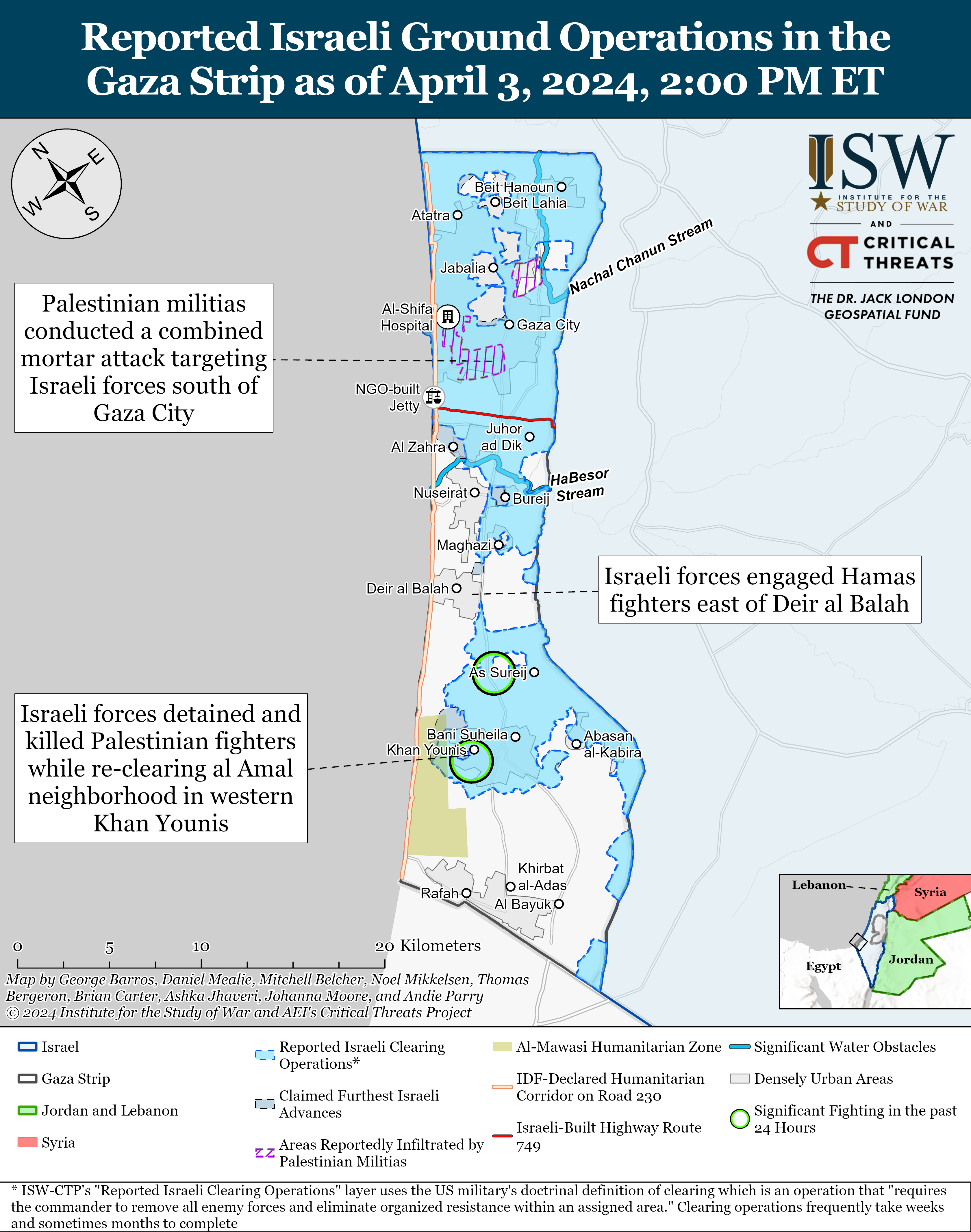Israeli forces have engaged Palestinian fighters around Deir al Balah in the central Gaza Strip in recent days, suggesting that Israeli forces are advancing into the area.[20] Hamas fired a thermobaric rocket targeting Israeli forces east of Deir al Balah on April 3.[21]